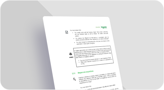 Anti - Corruption Policy – Version 3 – September 2021 8 Internal During the review of specific contracts inherited from a company just acquired, you learn that some “privileges” were granted several years ago by the company to its clients to maintain the relationship, such as regular invitations to sports events for the management and their families, and annual event with entertainment activities were planned, hosted and paid by the company. You must report that to your Compliance Officer. Even if the company is a joint venture in which Schneider Electric has only shares, we must ensure compliance with laws and regulations and promote our Trust Charter and Anticorruption Policy . You must ensure that : • You comply strictly with the Business Agent Policy before contracting with any Business Agent as well as through the whole contractual relation; • You conduct due diligence on third parties in accordance with our internal processes and have them approved by the relevant managers; • You never engage in a relationship with a third party who refuses a clear commitment to fight against corruption; 2.2.4 Mergers and acquisitions Acquiring a company or company shares or proceeding to a merger with another company may represent some risk for Schneider Electric. Once an acquisition is consummated, we may be held liable for wrongdoings occurring before the acquisition or the merger. You must ensure that : • You comply with internal procedures of due diligence related to M&A operations; • You ensure full compliance with Post - Merger Integration process, especially regarding implementation of our Trust Charter and our Anticorruption Policy . • You report to your Compliance Officer any suspicions of violation of either our Anticorruption Policy and of anticorruption laws and regulations. A supplier approaches you to inform you that he has relatives working for some potential clients to which Schneider Electric will submit an offer and he proposes to liaise with such relatives asking them to do a favor for Schneider Electric. He suggests being paid for this “assistance” by issuing an invoice for “other costs” linked to its supplying agreement. You must refuse the proposal and report to your Compliance Officer. “Other costs” allocation requested by a contractor is considered as a red flag.