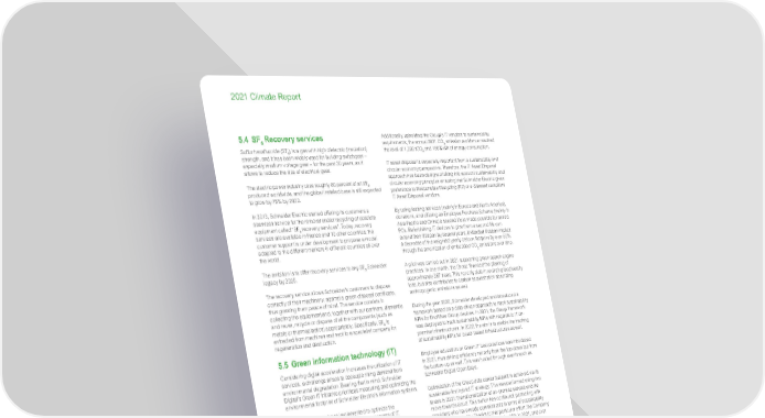 www.se.com Schneider Electric 18 2021 Climate Report 5.4 SF 6 Recovery services Sulfur hexafluoride (SF 6 ) is a gas with high dielectric (insulation) strength, and it has been widely used for building switchgear – especially medium voltage gear – for the past 30 years, as it allows to reduce the size of electrical gear. The electric power industry uses roughly 80 percent of all SF 6 produced worldwide, and the global installed base is still expected to grow by 75% by 2030. In 2013, Schneider Electric started offering its customers a seamless service for the removal and/or recycling of obsolete equipment called “SF 6 recovery services”. Today, recovery services are available in France and 10 other countries; the customer support is under development to propose a model adapted to the different markets in different countries all over the world. The ambition is to offer recovery services to any SF 6 Schneider legacy by 2025. The recovery service allows Schneider’s customers to dispose correctly of their machinery, against a green disposal certificate, thus granting them peace of mind. The service consists in collecting the equipment and, together with our partners, dismantle and reuse, recycle or dispose of all the components (such as metals or thermoplastics) appropriately. Specifically, SF 6 is extracted from machines and sent to a specialist company for regeneration and destruction. 5.5 Green information technology (IT) Considering digital acceleration increases the utilization of IT services, a challenge arises to decouple rising demand from environmental degradation. Bearing that in mind, Schneider Digital’s Green IT initiative prioritizes measuring and optimizing the environmental footprint of Schneider Electric’s information systems. An action plan has been implemented to optimize the environmental footprint of the various components of IT. The Group IT Asset Management (ITAM) Policy and standards have been updated with a strong focus on standardization, sustainability, and circular economy enablement, creating a holistic approach to sustainability throughout the entire lifecycle of IT assets. The consolidation and adjustment of the personal computer (PC) replacement lifecycle allowed Schneider to reduce its yearly PC carbon footprint by more than 15%. Carbon footprint reduction is an integrated requirement for the IT vendor selection processes. Consequently, new PCs are up to 40% more energy efficient and have a 50% lower carbon footprint than the corresponding end-of-life equipment to be replaced. Shifting demand to standardized PC models has resulted in an estimated 1,000 tonnes of avoided CO 2 /year in 2020. Setting ultra-small form factors as the default PC choice has also resulted in further CO 2 avoidance of more than 1,500 tonnes per year. Additionally, upholding the Group’s IT vendors to sustainability requirements, the annual 2021 CO 2 emission avoidance reached the level of 1,300 tCO 2 and 180 MWh of energy consumption. IT asset disposal is especially important from a sustainability and circular economy perspective. Therefore, the IT Asset Disposal approach has been designed taking into account sustainability and circular economy principles ensuring that Schneider Electric gives preference to Responsible Recycling (R2) or e-Steward compliant IT Asset Disposal vendors. By using leasing services (mainly in Europe and North America), donations, and offering an Employee Purchase Scheme (mainly in Asia Pacific and China) a second life is made possible for retired PCs. Refurbishing IT devices to give them a second life can extend their lifespan by several years. Extended lifespan implies a decrease of the weighted yearly carbon footprint by over 50% through the amortization of embedded CO 2 emissions over time. A pilot was carried out in 2021 supporting green search engine practices. In one month, the Group financed the planting of approximately 387 trees. This not only aids in reversing biodiversity loss, but also contributes to carbon sequestration absorbing anthropogenic emissions as well. During the year 2020, Schneider developed and introduced a framework based on a data-driven approach to track sustainability KPIs for End User Group devices. In 2021, the Group framework was deployed to track sustainability KPIs with regards to IT on- premise infrastructures. In 2022, the aim is to enable the tracking of sustainability KPIs for cloud-based infrastructures as well. Employee education on Green IT best practices was introduced in 2021, thus driving efficiency not only from the top-down but from the bottom-up as well. This was hosted through events such as Schneider Digital Open Days. Optimization of the Group data center footprint is achieved via its sustainable-first hybrid IT strategy. This was performed using two levers in 2021: the rationalization of on-premise servers and the move towards cloud. This switch has continued, partnering with providers who have made commitments in terms of sustainability and carbon neutrality. Thanks to that particular effort, the Company cloud infrastructure footprint increased by 25% in 2021, and over 80% of its server infrastructure has been virtualized. In addition to that, on-site servers were rationalized, thus saving about 1,300 tonnes of CO 2 in 2021. Schneider Electric has been utilizing Business Cloud Storage from a vendor which uses data centers that have achieved or have committed to achieve 100% renewable energy targets, therefore reducing its carbon footprint. In 2022, the aim is to migrate to a new solution which, through a data optimization approach, will allow a reduction of up to 40% of the size of used cloud storage data, thus further reducing corresponding carbon footprint emissions.
