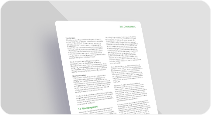 5 Life Is On | Schneider Electric www.se.com 2021 Climate Report Transition risks Schneider considers the possible financial impacts of future CO 2 costs on its activities, by taking into consideration both operational and supply chain footprints. Given the relatively low level of the Group’s Scope 1 and 2 carbon emissions, carbon pricing has indirect rather than direct impacts, resulting in increased supply chain costs, especially regarding the purchase of raw materials and manufactured components containing metals and plastics. A carbon tax at EUR 50/tonne of CO 2 is estimated to have an impact on the Group’s industrial supply chain up to EUR 420 million globally (including direct and indirect impacts). Climate change mitigation will likely lead to regulation strengthening, which can disrupt markets. For instance, SF 6 -insulated switchgear can have a significant impact on climate change if SF 6 is mishandled at the end of life of the equipment and leaks into the atmosphere. Schneider Electric strives to anticipate regulation changes and launches innovative SF 6 -free solutions. Workplace disruptions Extreme weather events, floods, droughts, and other climate impacts will increasingly put pressure onto supply chains. Shortages of all kinds can translate directly into revenue loss (missed orders), increased costs (urgent shipping), and increased working capital requirements (stock management). Extreme events can also cause damage to property and assets. This risk can be mitigated by adopting a flexible and resilient supply chain, with the ability to rebalance supply and manufacturing. To further tie climate-related issues to financial planning, Schneider successfully launched the first-ever sustainability-linked convertible bonds in 2020. This bond has been linked to three SSI targets by including the objective to save and avoid 800 million tonnes of CO 2 on the customers’ end by 2025. 1.3 Risk management Risks are identified and assessed through specific internal and external metrics, but also through interviews with experts and leaders, run by the Internal Audit Department and the Group Risk Management Department, to update the list of general risks at Group level each year. In 2021, around 40 of the Group’s top managers were interviewed in addition to Board members. Environment and climate-related risks are included in Schneider’s unique risk taxonomy (more details in the Universal Registration Document). Every three years, a materiality analysis is conducted by the Sustainability department, leveraging an external consultant, and complements the risk analysis with a focus on environment, social, and governance (ESG) topics and longer-term risks and opportunities. Overall, the different governance bodies involved in the definition and monitoring of the sustainability commitments and programs (SSI and SSE), and in particular the Carbon Committee, are in charge of defining strategic mitigation programs in response to the risks and opportunities identified. Strategic programs defined at Group level are then cascaded into business divisions, down to the sites for implementation, and are monitored through the digital platform, EcoStruxure ™ Resource Advisor. Performance against those programs is published quarterly in the Schneider Sustainability Impact (SSI), and annually in the Schneider Sustainability Essentials (SSE) and Universal Registration Document. Each program of the SSI has a dedicated pilot in charge of driving the transformation, and is sponsored at the Senior Vice-President and Executive levels to ensure management control and oversight. Climate adaptation risks are also studied and mitigated at site level for the industrial sites. The Group’s Property Damage and Business Interruption program, inspired from ISO 22301 standard, maps substantive risks of financial impact on the business, including asset destruction (buildings, equipment, inventories) and profit loss due to business interruption. The program reviews annually the natural hazard exposures of our manufacturing and logistic locations. An example of a risk analyzed at site level is flooding risks. Risk analysis of industrial sites includes an analysis of interdependencies, study of alternative supply, and estimation of time to recover in case of damage, etc. Typically, all critical industrial sites are externally audited onsite at least every two years. In addition, starting 2021, Global Supply Chain has defined a resiliency index to assess and mitigate business interruption risks. This resiliency index covers several risks (such as physical security, political stability, etc.) and includes exposure to natural and climate-related hazards and mitigations. Finally, environmental risks (including climate) are assessed and mitigated at site level through the Group’s Integrated Management System (IMS). The IMS covers the supply chain sites (plants, distribution centers, large offices) and hosts ISO 14001, ISO 50001, ISO 9001, and OSHAS 18000/ISO 45001 compliance management systems. Each site is audited periodically, either externally by Bureau Veritas (every three years), or internally. At present, the impact of climate-related matters is not material to the Group’s financial statements. With suppliers, sustainability risks (including natural and climate- related hazards), are embedded into Supplier Risk Assessment. This process enables to define risk mitigation action plans with suppliers, as well as prioritize double sourcing strategies. Leveraging external data providers, the Group monitors events across 10,000 nodes (such as ports and critical supplier locations) to shorten reaction time when events occur and minimize business impact.