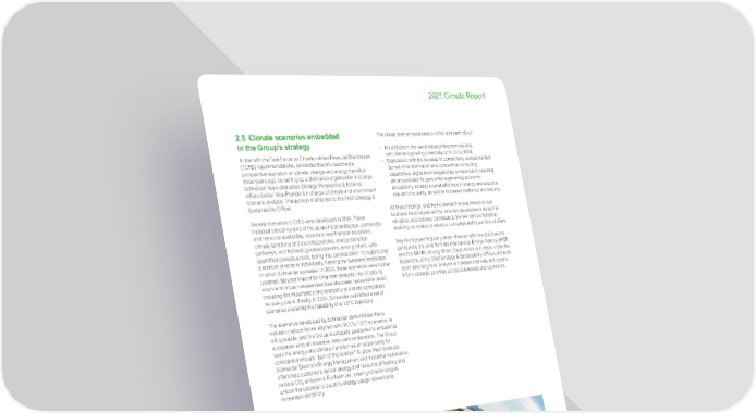 9 Life Is On | Schneider Electric www.se.com 2021 Climate Report 2.5 C limate scenarios embedded in the Group’s strategy In line with the Task Force on Climate-related Financial Disclosures (TCFD) recommendations, Schneider Electric launched a prospective approach on climate change and energy transition three years ago, by setting up a dedicated organization in charge. Schneider has a dedicated Strategy Prospective & External Affairs Senior Vice-President in charge of climate and environment scenario analysis. That person is attached to the Chief Strategy & Sustainability Officer. Several scenarios to 2050 were developed in 2019. Those included critical reviews of the geopolitical landscape, commodity and resource availability, economic and financial evolutions, climate sensitivity and evolving policies, energy transition pathways, and technology developments, among others, with quantified consequences, taking into consideration 10 regions and a number of sectors individually, framing the business landscape in which Schneider operates. In 2020, these scenarios were further updated. Beyond impact for long-term analysis, the COVID-19 short-term impact assessment has also been reviewed in detail, including the importance and feasibility of climate-compatible recovery plans. Finally, in 2021, Schneider published a set of scenarios exploring the feasibility of a 1.5°C trajectory. The scenarios developed by Schneider demonstrate that a net-zero carbon future, aligned with IPCC’s 1.5°C scenarios, is still possible, and the Group is uniquely positioned to embark its ecosystem onto an inclusive, zero-carbon transition. The Group sees the energy and climate transition as an opportunity for companies who are “part of the solution” to grow their revenues. Schneider Electric’s Energy Management and Industrial Automation offers help customers deliver energy and resource efficiency and reduce CO 2 emissions. Furthermore, smart grid technologies unlock the potential to electrify energy usage, powered by renewable electricity. The Group sees an acceleration of the dominant role of: • E lectrification: the world is becoming more electric, with demand growing potentially up to 3x by 2050; • D igitization: with the increase in connectivity, complemented by real-time information and competitive computing capabilities, digital technologies play a major role in reaching decarbonization targets while augmenting economic productivity, notably around efficiency in energy and resource use and circularity, as well as increased resiliency and security. All these findings, and their potential financial impact on our business have helped us fine-tune key development areas that will allow us to actively contribute to the low-carbon transition, enabling us notably to develop our sustainability portfolio of offers. Key findings are regularly cross-checked with new publications, particularly the ones from the International Energy Agency, BNEF, and the IRENA, among others. Governance is in place, under the leadership of the Chief Strategy & Sustainability Officer, and both short- and long-term analysis are shared internally and used to inform strategic priorities across businesses and operations.