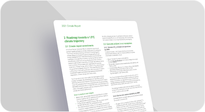 www.se.com Schneider Electric 6 2021 Climate Report 2 Roadmap towards a 1.5°C cl imate trajectory 2.1 Climate impact commitments In its Trust Charter, Schneider Electric adopts an unequivocal position regarding impact on climate change and CO 2 emissions. The Group has been a leading contributor to the fight against climate change for the past 15 years by implementing its own energy management and industrial automation solutions across operations, by supporting its clients in achieving their low-carbon and efficiency objectives, and by allowing more than 30 million people to gain access to electricity. Schneider also takes an active role in a variety of multi-stakeholder organizations to promote solutions to climate change, call for a price to CO 2 , and strengthen CO 2 governance globally. Since 2011, the Group has also been contributing to the Livelihoods Funds, which proposes innovative investment models to simultaneously address environmental degradation, climate change, and rural poverty. The Group aims to be a role model in the fight against climate change, by sharply decarbonizing its own operations and by delivering services and solutions that allow its customers to reduce more CO 2 emissions than those produced by the Group’s activities. Ultimately Schneider aims to reduce the end-to-end emissions of its offers, by engaging suppliers and eco-designing offers for lifecycle climate and circular performance. Short to medium-term targets • Before 2025, demonstrate that Schneider Electric is carbon p ositive together with its customers and partners, thanks to CO 2 savings delivered by EcoStruxure ™ . • On t he Group’s operations (scope 1&2): be carbon neutral by 2025 and net-zero CO 2 emissions by 2030. • On i ndirect emissions (scope 3) in its supply chain and with customers: reduce emissions by 35% by 2030 (vs 2017), by actively engaging suppliers to accelerate their climate strategy, by sourcing greener materials, and by proposing more efficient solutions to its customers. The Group’s 2030 targets (net-zero CO 2 emissions on scope 1 and 2, and -35% on scope 3) have been validated 1.5°C-aligned by the Science-Based Target initiative in 2019. Long-term targets • Become carbon neutral on the Group’s full end-to-end footprint by 2 040 (scopes 1, 2 and 3), 10 years ahead of 1.5°C trajectory. This means that all Schneider’s products will be carbon neutral in 2040. • Eng age with suppliers towards a net-zero CO 2 supply chain by 2050. In 2040, the Group commits that all Schneider Electric products will be carbon neutral. By connecting technology, business, and collaboration, Schneider joins the likes of global partners, such as Amazon, Infosys, and Daimler to help deliver carbon neutrality by 2040 as part of the Climate Pledge, a jointly created initiative between Global Optimism and Amazon. The Climate Pledge was founded on the conviction that global businesses are responsible and accountable for acting on the climate crisis, together. This milestone is set 10 years earlier than the pledge made in 2015 by all United Nations country members at Paris COP21, showing the Group’s eagerness to accelerate the world economy decarbonization to respect the 1.5°C targets. By 2050, achieving net-zero CO 2 emissions in its supply chain will require Schneider Electric to work transversally with all stakeholders, from product design, to sourcing, manufacturing and shipping. 2.2 Concrete actions in our ecosystem 2.2.1 Net-zero CO 2 emissions in operations by 2030 To deliver its Scope 1 and 2 targets, the Group has launched several transformations under the Climate and Resources pillars of Schneider Sustainability Impact: • R each 150 Zero-CO 2 sites by 2025 (SSE #1), • Propose SF 6 -free alternatives for all medium voltage technologies b y 2025 (SSE #2), • Source 90% of electricity from renewables by 2025 (SSE #3), and 1 00% by 2030, • Increase energy efficiency in our sites by 15% by 2025 (SSE #5) and double energy productivity by 2030 (vs 2005), • Shift one third of corporate vehicle fleet to electric vehicles by 2025 (SSE #7), and 100% by 2030. The Group leverages its Power and Building EcoStruxure ™ IoT architectures to deliver these ambitions, monitor and optimize energy consumption, manage assets and grid infrastructure, manage distributed renewable energy resources and electricity load, monitor energy quality, and power electric vehicles. This strategy has delivered an absolute reduction of 405,028 tonnes of CO 2 e emissions on Scope 1 and 2 (from 699,079 tCO 2 e in 2017), which is a 58% decrease. 2.2.2 End-to-end carbon neutrality by 2040 Schneider Electric is already taking concrete actions to engage its suppliers to decarbonize: • Eng age 1,000 top suppliers to reduce their operational CO 2 em issions by 50% with The Zero Carbon project (SSI #3). • Re duce purchase-related CO 2 emissions with EcoDesign Way ™ to improve the end-to-end lifecycle environmental footprint of its offers, notably by reducing and substituting materials and components in products. The Group aims to source 50% green materials by 2025, favoring bio-sourced, recycled, and sustainable options (SSI #4). • Ha ve 100% of its primary and secondary packaging free from single-use plastics and made from recycled cardboard (SSI #5). • Red uce CO 2 emissions from freight and logistics activities, by shifting from air to sea freight and optimizing fill rates and travel routes (SSE #4). • Red uce CO 2 emissions from waste management, with its “Waste as Worth” program. In 2021, 126 sites achieved the “Waste to Resources” designation as part of SSE #9. • Red uce CO 2 emissions from capital goods by optimizing real estate space occupancy as saved surfaces translate directly into lower CO 2 emissions, as well as spared natural habitats and agricultural land.