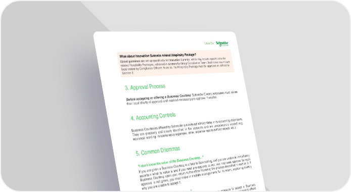 Gifts & Hospitality Policy – External Version 6 Before accepting or offering a Business C ourtesy , Schneider Electric employees must review their local charts of approval and received necessary pre - approval if needed. Business C ourtesies offered by Schneider are entered without delay in its accounting document s. They are precisely and clearly identified in the accounts and are unequivocally worded (e.g. equivocal wording: miscellaneous expenses, other, expense reports without receipt, etc .). “I don’t know the value of the Business C ourtesy ...” If you are given a Business C ourtesy in a face - to - face setting, and you are unable to immediately ascertain wh at its value is and if you need pre - approval or not , you may seek approval for such Business C ourtesy upon your return to the office following the process described in section 3 . If approval is not given, you must make immediate arrangements for its return, explaining politely why you are unable to accept it. “But it would be impolite to refuse...” Employees may encounter situations where they feel social pressure to accept a Business C ourtesy that goes beyond Schneider Electric ’s Gifts & Hospitality policy , and do not wish to offend the donor. In such case, employees have to decide on the spur of th e moment and must use their judgment. In practice, a polite refusal, by referring to Schneider Electric ’s internal policy, may well be understood. “Surely there is no problem with a seasonal gift...” Similar dilemmas can apply to seasonal gift - giving, for example at Christmas , Ramadan or during the New Year period. Schneider’s polic y applies all year round. As such, employees need to ensure that they do not offer or accept anything that does not align with this policy during such seasonal periods by respecting the rules defined in this policy. What about Innovation Summits related Hospitality Package? Global guidelines are set up specifically for Innovation Summits, which may include specific rules for related Hospitality Packages, validated in advance by Group Compliance Team. Such rules may include local review by Compliance Officers: to do so, the Hospitality Package must be approv ed as defined in Section 3. 3. Approval Process 4. Accounting Controls 5. Common Dilemmas