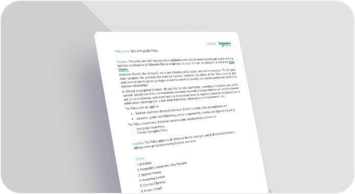 Gifts & Hospitality Policy – External Version 2 Policy name: Gifts & Hospitality Policy Purpose: This policy sets forth the mandatory compliance rules and processes regarding giving and receiving business courtesies by all Schneider Electric employees. As such, it details the principles set forth in the Trust Charter . Schneider Electric (the Company) h as a zero - tolerance policy against any form of corruption. The Company does recognize that providing and receiving b usiness c ourtesies (as defined in this Policy) such as gifts, entertainment and hospitality packages is common practice to develop and maintain positive and constructive business relation ships. In different geographical locations, this practice can vary significantly, depending on local laws and specific customs. Irrespective of that, some business courtesies may create improper influence and conflicts of interest and , in some instances, such incentives may be or be perceived by regulatory bodies as corrupt practices to obtain undue advantage ( ex. a deal, inside information, advantageous contractual terms , etc . ) . Th e Policy does not apply to : • b usiness c ourtesies offered by Schneider Electric internally to its own employees and • donations , gran t s (see Philanthropy policy ) or sponsorship activities (see Sponsorship policy ) . The Policy compl e ments Schneider’s existing rules, including those contained in: - The Global Travel Policy - The Anti - Corruption Policy Audience: The Policy applies to all Schneider Electric employees and in all Schneider Electric’s affiliates when giving and receiving business courtesies . Content: 1. Definitions 2. Acceptability assessment – Key Principles 3. Approval Process 4. A ccounting C ontrols 5 . Common D ilemmas 6 . In case of doubt Confidentiality Status: Public Local adaptation authorization: Not possible Document Owner: Audrey Morin, Group Compliance Director Document Reviewer s : Nicolas Vlieghe , SVP Chief C ompliance Officer Peter Wexler, SVP Chief Legal Officer Chris Leong, EVP Chief Marketing Officer Karen Clarke, SVP Global Effectiveness Julie Ashton - Howorth, Chief Accounting Officer Pierre Lormeau, Fraud Examination Team Director Document Approver: Hervé Coureil, EVP Chief Governance Officer and Secretary General