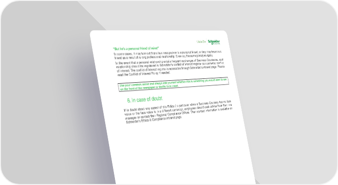 Gifts & Hospitality Policy – External Version 7 “But he’s a personal friend of mine!” In some cases, it may turn out that a business partner is a personal friend, or they may become a friend as a result of a long professional relationship. Even so, the same principles apply. In the event that a personal relationship entails frequent exchan ges of Business C ourtesies , said relationship should be registered in Schneider’s conflict of interest regis ter as a potential conflict of interest. The conflict of interest regist er is accessible through Schneider’s intranet page. Please read the Conflict of Interest Policy if needed. Use your common sense and always ask yourself whether this is something you would want to see on the front of the newspaper or testify to in court. If in doubt about any aspect of this Policy (in particular when a Business C ourtesy has no face value or the face value is in a different currency), employees should seek advice from their line manager or contact their Regional Compliance Officer. Their contact information is available on Schneider’s Ethics & Compliance intranet page. 6. In case of doubt