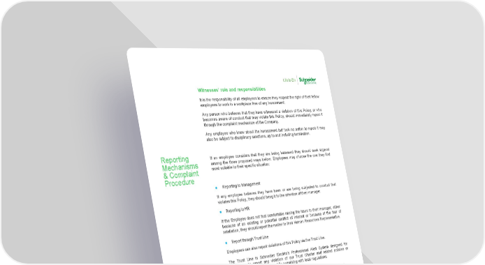 Global Anti-Harassment Policy – Version 2 6 Internal Witnesses’ role and responsibilities It is the responsibility of all employees to ensure they respect the right of their fellow employees to work in a workplace free of any harassment. Any person who believes that they have witnessed a violation of this Policy, or who becomes aware of conduct that may violate this Policy, should immediately report it through the complaint mechanism of the Company. Any employee who knew about the harassment but took no action to report it may also be subject to disciplinary sanctions, up to and including termination. If an employee considers that they are being harassed they should seek support among the three proposed ways below. Employees may choose the one they find most suitable to their specific situation: Reporting to Management If any employee believes they have been or are being subjected to conduct that violates this Policy, they should bring it to the attention of their manager. Reporting to HR If the Employee does not feel comfortable raising the issue to their manager, either because of an existing or potential conflict of interest or because of the fear of retaliation, they should report the matter to their Human Resources Representative. Report through Trust Line Employees can also report violations of this Policy via the Trust Line. The Trust Line is Schneider Electric’s Professional Alert System designed for employees to report any violation of our Trust Charter and related policies or directives, including this one, while complying with local regulations. https://www.se.com/ww/en/about-us/sustainability/responsibility-ethics/trustline/ Schneider Electric strictly prohibits retaliation against anyone who, in good faith, reports violations of this Policy or participates in an investigation, even if the investigation does not ultimately prove the concerns. Dishonest, bad faith, or otherwise abusive reports (such as false personal attacks aimed at specific individuals) are prohibited and may result in disciplinary action. Reporting Mechanisms & Complaint Procedure Confidentiality & Protection Against Retaliation