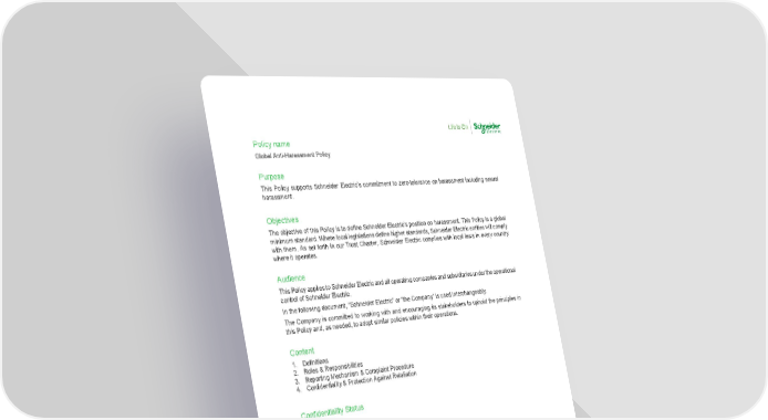 Global Anti-Harassment Policy – Version 2 2 Internal Policy name Global Anti-Harassment Policy Purpose This Policy supports Schneider Electric’s commitment to zero-tolerance on harassment including sexual harassment. Objectives The objective of this Policy is to define Schneider Electric’s position on harassment. This Policy is a global minimum standard. Where local legislations define higher standards, Schneider Electric entities will comply with them. As set forth in our Trust Charter, Schneider Electric complies with local laws in every country where it operates. Audience This Policy applies to Schneider Electric and all operating companies and subsidiaries under the operational control of Schneider Electric. In the following document, “Schneider Electric” or “the Company” is used interchangeably. The Company is committed to working with and encouraging its stakeholders to uphold the principles in this Policy and, as needed, to adopt similar policies within their operations. Content 1. Definitions 2. Roles & Responsibilities 3. Reporting Mechanism & Complaint Procedure 4. Confidentiality & Protection Against Retaliation Confidentiality Status Public Local adaptation authorization Yes, if more restrictive. Document Owner Sandrine Reinneis, Group HR Compliance Officer Document Reviewer Tina Mylon, SVP Talent & Diversity Nicolas Vlieghe, Chief Compliance Officer Peter Wexler, SVP Chief Legal Officer Audrey Morin, Group Compliance Director Document Approver Charise Le, Chief Human Resources Officer