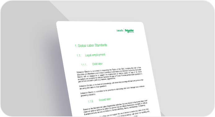 Human Rights Global Policy - Version 1 5 / 9 1. Global Labor Standards 1.1. Legal employment 1.1.1. Child labor Schneider Electric is committed to respecting the Rights of the Child, including the right to free education, and ther efore is committed to contribut e to elimination of child labor. In practice, Schneider Electric will not engage in or support the employment of children under the age of 18 . Some exceptions are accepted for ch ildren b etween the age of 15 and 18 when professional experience is part of their education path (e.g. trainees, apprentices) . Schneider Electric , to the best of its knowledge, will refrain from working with business partners that are using child labor in their operation s . Schneider Electric is committed to be proactive in eliminating child labor through local initiatives promoting education. 1.1.2. Forced labor Based on the I nternational L abor O rganization definition, the term forced or involuntary labor shall mean all work or service s for which the person has not offered themselves voluntarily or willingly . Examples include, but are not limited to, human trafficking, slavery, debt bondage, ID retaining. Schneider Electric will neither u se nor support the use of forced o r involuntary labor of any kind , directly or indirectly . Schneider Electric , to the best of its knowledge, will refrain from working with business partners that are using forced or compulsory labor in their operation s . 1.2. Freedom of association and collective bargaining Schneider Electric considers freedom of association as the basis of a regular dialogue between a com pany and its employees. To that purpose, Schneider Electric respects the individual right of its employees to freely join, participate in or quit labor organizations to assert and defend their in terests. Subsequently, Schneider Electric guarantees that any employee wishing to do so shall be protected against any internal measure limiting his or her freedom of association such as discrimination of any kind, pay loss or dismissal. Schneider Electric also recognizes the importance of dialogue with freely appointed employee represent atives, employee representative bodies (such as Works Councils or employee forums) or organizations (like trade unions), and supports collective bargaining.