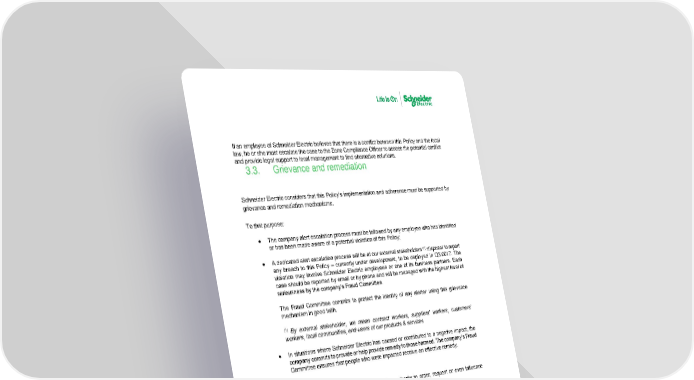 Human Rights Global Policy - Version 1 9 / 9 If an employee of Schneider Electric believes that there is a conflict between this Policy and the local law, he or s he must escalate the case to the Zone Compliance Officer to assess the potential conflict and provide legal support t o local management to find alternative solutions. 3.3. Grievance and remediation Schneider Electric considers that this Policy ’s implementation and adherence must be supported by grievance and remediation mechanisms. To that purpose: T he company alert escalation process must be followed by any employee who has identified or has been made aware of a potential violation of this Policy ; A dedicated alert escalation process will be at our external stakeholders' (1) disposal to report any breach to this Policy – currently under development , to be deployed in Q3/2017 . The violation may involve Schneider Electric employees or one of its business partners. Each case should be reported by e mail or by phone and will be managed with the highest level of serious ness by the company’s Fraud Committee. The Fraud Committee commits to protect the identity of any alerter using this grievance mechanism in good faith. (1) By external stakeholder, we mean contract workers, suppliers' workers, customers' workers, local communities, end - users of our products & services In situations where Schneider Electric has caused or contributed to a negative impact, the company commits to provide or help provide remedy to those harmed. The company’s Fraud Committee ensures that peop le who were impacted receive an effective remedy. No employee, whatever his or her position, has the authority to order, request or even influence another employee or stakeholder to violate this Policy . Moreover, each employee is invited to promote and enhance this Policy to other employees and stakeholders.