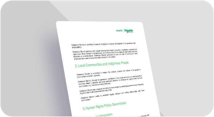Human Rights Global Policy - Version 1 8 / 9 Schneider Electric is committed toward its employees to ensure development of competencies and employability. Schneider Electric provides with regular development means (education, experience, exposure) on topics that it finds relevant to the business, a nd to the function of the employee and his/her expected behavior as a professional. Schneider Electric promotes at least one day of learning for every employee each year to keep their skills relevant in the market. 2. Local Communities and Indigenous People Schneider Electric is committed to respect the cultures, customs and values of the people in communities in which it operates. Schneider Electric, through its operations, contributes to the social and economic development in countries where it operates and pays particular attention to development opportunities for local communities (e.g.: access to energy solutions) . Schneider Electric also respects the rights of communities by identifying, pr eventing and mitigating impact to the local environment and way of life . Schneider Electric seeks to establish regular dialogue and lasting relationships with these communities. 3. Human Rights Policy Governance 3.1. Implementation Beyond the formulation of this Policy , Schneider Electric is committed to provide its employees with periodical communications , trainings and support to promote this Policy , including a program of internal capacity building. Moreover, Schneider Electric is committed to conduct due diligences of relevancy in high ri sk locations or projects and to incorporate this Policy through the annually key internal control campaign led by internal audit . 3.2. Compliance Schneider Electric commits to comply with the applicable law of every country where it operates. In case local law contradicts the above Global Labor Standards by being less protective of Human Rights, these Standards must be considered as a minimum that Schneider Electric commits to apply ; In case the application of Schneider Electric Global Labor Standards would breach the applicable law in a given country, Schneider Electric will search alternatives to act according to its Human Rights values as defined in this Policy while not breaching the applicable law .