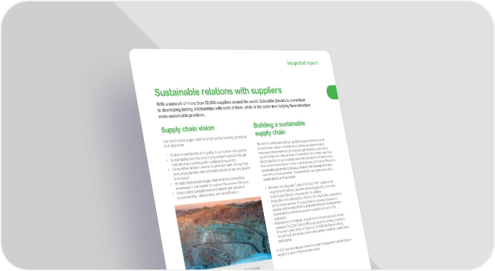 39 Life Is On | Schneider Electric www.se.com Integrated report With a network of more than 52,000 suppliers around the world, Schneider Electric is committed to developing lasting relationships with each of them, while at the same time helping them introduce more sustainable practices. Supply chain vision Our world-class supply chain is driven by the following principles and objectives: • Customer satisfaction and quality is our number one priority. • Sustainability is at the core of procurement actions through innovation and working with sustainable suppliers. • Competitive landed costs and optimized cash, driving high level of productivity and Schneider Electric’s top-line growth and margin. • An agile and secure supply chain that is a competitive advantage in the market throughout the product lifecycle. • World-class competencies and talents with values of accountability, collaboration, and simplification. We’re deeply concerned about social and environmental conditions in mines that could supply such “conflict minerals” for our products. When the country of origin is known to be in the conflict zone, 100% of the smelters and refiners were verified conformant. Therefore, the Group has no reason to believe that any conflict minerals the Group sourced, have directly or indirectly financed or benefitted armed conflict in the covered countries. Building a sustainable supply chain We aim to collaborate with our global supplier network for an inclusive and carbon neutral world, where ecosystems and resources are preserved, and people get access to economic opportunities and decent lives. Our ambition is to make sure that the production of our products and services are not linked to any kind of environmental or human rights abuses. Schneider Electric’s sustainable purchasing strategy ensures risk management and commits to improvements. To achieve this, we have embedded sustainability at three levels: • Provision of a Supplier Code of Conduct with fundamental requirements that all suppliers delivering goods or services to Schneider Electric are expected to adhere • Integration of sustainability criteria in the day to day, operational procurement actions. The qualification process focuses on people, social responsibility, and environmental management. Sustainability criteria account for a significant part of the evaluation. • Deployment of strategic programs in thematic areas of climate change (The Zero Carbon Project), decent working conditions & human rights (Duty of Vigilance, ISO26000, Decent Work), circularity & resource conservation (green materials, sustainable packaging). In 2021 we have begun a new five-year engagement with ambitious targets for each of the thematic areas. Sustainable relations with suppliers Conflict minerals: we support the US conflict minerals legislation and actively avoid the use of such minerals in our supply chain 2021 highlights Supplier Engagement Leader award from CDP. 1,000 Suppliers committed to the Zero Carbon Project. +5pts continuous increase of suppliers ISO2 6000 score. 21% total packaging spend attributed to sustainable packaging.