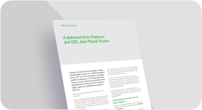 www.se.com Schneider Electric Integrated Report 2021 6 Integrated report A statement from Chairman and CEO, Jean-Pascal Tricoire The past two years have seen challenges, changes and uncertainties that few of us could have imagined back in 2019. The COVID-19 pandemic, the multiple and diverse responses to it, the rapid restart of the economy, a host of climate change-linked disasters, and numerous other disruptions have shaken up supply chains and unsettled business plans the world over. Many of these developments will stay with us in 2022, and even beyond. But the world has also had time to learn, to change, and to adapt. Climate action, efficiency, sustainability, digital innovation, and resilience to disruption, uncertainty and change are now top of the agenda for policy makers, businesses and even households around the globe, in a way that was simply not the case just two or three years ago. Of course, Schneider Electric hasn’t been immune to these upheavals. But our efforts, over the past 15 years, to embrace sustainability, digitization and electrification, and to empower all to make the most of our energy and resources, have stood us in good stead. In fact, if anything, our corporate purpose and positioning have been reinforced and vindicated by what the world has experienced since late 2019. It’s never been more important to bridge progress and sustainability for all. A business model built to support a sustainable future Schneider Electric received welcome, high-profile external recognition in January 2021, when Corporate Knights ranked us the world’s most sustainable corporation for the year. The recognition is a testament to the commitment of our people, our customers, partners and suppliers, who have, year after year, raised the bar, to make a positive impact on our organization, our business and community ecosystem, and on the entire world. Still, the science is clear: humanity is not acting fast enough to avert climate catastrophe. We all need to do more, and much faster, to leverage the technologies that already exist, and develop new ones for the future. That’s why, also in January 2021, we announced the most ambitious set of sustainability commitments in our history, spanning 2021-2025: to show that even companies that are already sustainability leaders have a responsibility to do even more. In late 2021, we also committed to being an Impact Company . We define that as a company that embraces environmental, social and governance (ESG) values into every dimension of its business. A company that aligns its mission to contribute these values, and that operates with a model that creates local impact, close to the communities it’s supporting. One of the guiding principles of this model is that acting on these principles, and on our purpose, also cements our financial performance. And that’s what makes us confident in our long-term sustainable growth. Accelerating core markets, and new pillars of growth Two technologies underpin the global economy’s transition to a sustainable, more resilient and lower-carbon future: digitization and electrification . It’s in these areas that we’ve built our expertise and leadership over the past years – and we’re feeling the accelerating demand for these technologies across end-markets ranging from buildings and industry, to data centers and infrastructure. In addition, to support future growth, we’ve supplemented this with three incremental growth drivers. Our services offer allows us to provide more value on our installed base, and to better serve our customers across the entire lifecycle. Our software portfolio provides unmatched capabilities in bridging the physical and digital world, allowing customers to reap the benefits of efficiency. Most recently, 2021 saw the finalization of our strategic acquisition of ETAP, as well as the closure of AVEVA’s acquisition of OSIsoft. Our next step is the development of a new category of software, through integrating our full portfolio across two core dimensions: the lifecycle and the operational domains. This is the first offer of its kind and has huge potential to support our customers by removing common operational frictions.