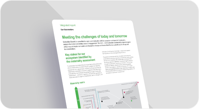 www.se.com Schneider Electric Integrated Report 2021 32 Integrated report 1.5 2.0 2.5 3.0 3.5 1.5 2.0 2.5 3.0 3.5 Internal Stakeholders External stakeholders Governance and Ethics Product stewardship Mission Social Environment Society Sustainable supply chain Becoming a leader of the circular economy and rethinking our resource footprint Being a role model in the effective reduction Decarbonizing our supply chain Guaranteeing cybersecurity of products and solutions Guaranteeing a 100% responsible offer Guaranteeing quality and safety of products Actively contributing to the rise of the industry 4.0 Guaranteeing optimal working health and safety conditions for our employees Developing regional value chains Aiming for zero corruption at all levels, in the whole value chain Promoting diversity and inclusion in all our professions, countries and operations Advocating an all electric and all digital world Facilitating renewable energy production Ensuring an expert and representative governance for long term sustainable value Being exemplary in the management of our customers and partners data Ensuring customer due diligence Becoming a key player in electric mobility Aiming for environmental excellence at our sites Ensuring our employees well-being in and out of the workplace Supporting our employees in the transformation of their profession Being a recognized access to energy player Ensuring an exemplary influence policy Contributing to the fight against energy poverty Ensuring fair pay for our employees Ensuring digital sobriety Contributing to training and education in energy & digital professions Ensuring social dialogue Limiting global impact on biodiversity, in our whole value chain Ensuring exemplary tax practices of our own CO 2 emissions Guaranteeing high social and environmental standards for subcontractors and suppliers Becoming a key player for a net zero carbon built environment* Meeting the challenges of today and tomorrow Schneider Electric is committed to open communication with its ecosystem and uses the feedback to analyze its market and define areas of engagement. The 2021 – 2025 Schneider Sustainability Impact program offers ways to implement quick and disruptive changes on issues identified as a priority by the Group and its stakeholders. Key stakes for our ecosystem identified by the materiality assessment To consolidate the relationship and expectations of its external and internal stakeholders, Schneider Electric updates its materiality assessment on a regular basis. In 2020, the Group launched the stakeholder consultation process to update its materiality matrix and build the new Schneider Sustainability Impact. Almost 200 stakeholders – customers, suppliers, international organizations, trade associations, experts, shareholders, senior managers, and members of the Executive Committee – were invited to assess the importance of the challenges facing the Group. The general consensus was that companies need to become more resilient in the face of growing environmental, social, political, and economic instability. What stakeholders most expect from the Group is genuine leadership in decarbonizing the economy through its businesses, products, and solutions. The four main trends were climate, circular economy, a fair and equitable transition, and digitized, cybersecure solutions. All 31 issues raised were deemed important, thus reinforcing our holistic vision of sustainability and the Company’s extended responsibility to its ecosystem, in particular its supply chain. Our Stakeholders Materiality matrix Committed with our partners