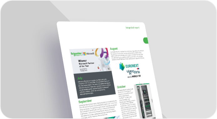 11 Life Is On | Schneider Electric www.se.com Integrated report Winner Microsoft Partner of the Year Sustainability Changemaker Microsoft Partner Network September Schneider Electric’s Lexington, Kentucky plant is recognized by the World Economic Forum as a Sustainability Lighthouse – one of only three worldwide. The World Economic Forum has also recognized the Company’s Smart Factory in Wuxi, China as an Advanced Lighthouse – the fourth Schneider Electric factory to receive this distinction to date, joining the Lexington, Kentucky; Batam, Indonesia; and Le Vaudreuil, France factories. October Schneider Electric announced the launch of new state-of- the-art connected PrismaSeT Active switchboards, C omPacT ™ molded-case circuit breakers, and PowerLogic ™ HeatTag sensors for its EcoStruxure ™ Power architecture. These innovative offers, poised to revolutionize electrical distribution, pave the way for the 100% connected building, where efficiency is maximized, and facility staff can foresee power loss and electrical fire risks. August Schneider Electric received top ranking by Vigeo Eiris, the principal European environmental, social, and governance (ESG) rating agency and part of the Moody’s Group. Schneider has also been included among the world’s top ESG performers in the mid-year reviews of the FTSE4Good Index and Euronext Vigeo Eiris indices. July Schneider Electric is recognized by Microsoft as the company’s 2021 Sustainability Changemaker Partner of the Year Award winner. The award recognizes the impact Schneider has had helping its customers set and achieve decarbonization goals using its flagship EcoStruxure ™ software solutions, which are underpinned by Microsoft technologies. December Schneider Electric wins four awards for Sustainability and Smart Home leadership at the CES 2022 Innovation Awards, recognizing its commitment to sustainability and innovation. The company’s Wiser Energy Center receives recognition in both the Sustainability and Smart Home categories for redefining home energy management and resiliency. Merten Ocean Plastic receives praise as the first home energy solution made from recycled ocean plastics, while the new Odace Sustainable collection made from recycled materials is named as a Sustainability category honoree. November Schneider Electric joined other industrial leaders and pioneers to form UniversalAutomation.org (UAO), an independent, not-for-profit association managing the reference implementation of a shared source runtime. For the first time, IT and OT software vendors, industrial end users, OEMs, and academics will share a common automation software layer across their automation technology – regardless of brand. The organization seeks to create an entirely new category of industrial automation and unleash the full potential of Industry 4.0.