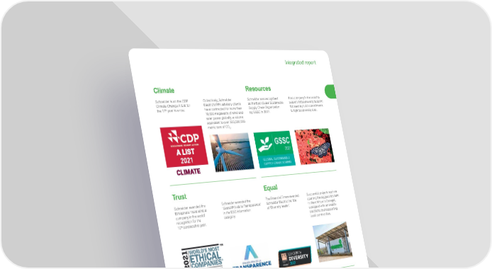 13 Life Is On | Schneider Electric www.se.com Integrated report Climate Schneider is on the CDP Climate Change A List for t h e 11 th year in a row. Collectively, Schneider Electric’s PPA advisory clients have contracted for more than 10,000 megawatts of wind and solar power globally, a volume equivalent to over 300,000,000 metric tons of CO 2 . Resources Schneider was recognized as the Best Global Sustainable Supply Chain Organization by GSSC in 2021. First company in the world to publish its biodiversity footprint followed by bold commitments to fight biodiversity loss. Equal The Financial Times awarded Schneider Electric the title of ‘Diversity leader’. Successful projects such as opening the biggest fish farm in West Africa in Senegal, equipped with renewable electricity and supporting local communities. Local 100% of countries committed to act for communities: launching 200+ local initiatives. Joining forces to support COVID-19 relief in India thanks to 6,500+ contributors from 48 countries taking actions to support emergency needs and recovery for education thanks to the Tomorrow Rising Fund. Tr ust Schneider awarded the Ethisphere ‘most ethical company in the world’ recognition for the 10 th consecutive year. Schneider awarded the ‘Grand Prix de la Transparence’ in the ESG information category. Generations Committed to train 10,000 underprivileged young adults in Africa through the newly created French Southern African Schneider Electric Education Center. 25,000+ students up for a sustainable challenge – a record number of registrations to our global Go Green competition.