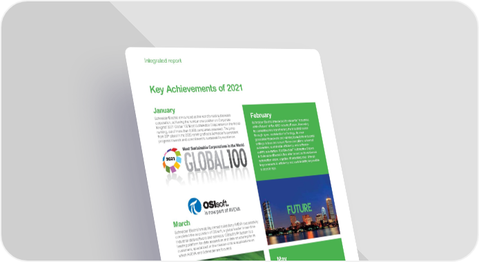 www.se.com Schneider Electric Integrated Report 2021 10 Integrated report SUSTAINABILITY The Zero Carbon Project Key Achievements of 2021 January Schneider Electric announced as the world’s most sustainable corporation, achieving the number one position on Corporate Knights’ 2021 Global 100 Most Sustainable Corporations in the World ranking, out of more than 8,000 companies assessed. The jump from 29 th place in the 2020 ranking reflects Schneider’s consistent progress towards and commitment to sustainability excellence. March Schneider Electric’s majority owned subsidiary AVEVA successfully completed the acquisition of OSIsoft, a global leader in real-time industrial data software and services. OSIsoft’s PI System is a leading platform for data acquisition and data structuring for its customers, specialized on the mission-critical applications on which AVEVA and Schneider are focused. April Schneider Electric launches the Zero Carbon Project. Under the new initiative, the Company will partner with its top 1,000 suppliers – which represent 70% of Schneider’s suppliers emissions – to halve their operations’ CO 2 emissions by 2025. The initiative is part of Schneider’s 2021-2025 sustainability goals and is a concrete step towards limiting the rise in average global temperatures to 1.5°C or less by 2100, as targeted by the Paris Agreement. June Schneider Electric successfully completed the acquisition of Operation Technology, Inc. (ETAP), the leading software provider in electrical network design and simulation. The closing of this transaction will further enhance the Group’s software capabilities in the “Design” phase of lifecycle digitization. May Schneider Electric ranked 4 th in Gartner’s Top 25 Supply Chain Award, for the second consecutive year, and 1 st in Europe. The inclusion is the 6 th time that Schneider has featured on the Top 25 list, and it underlines the Company’s consistent efforts to strengthen and digitize its supply chain operations. February Schneider Electric introduced its vision for “Industries of the Future” at the ARC Industry Forum. Renewing its commitment to transforming the industrial sector through open, sustainable technology, its next- generation framework and winning formula for industrial settings is founded around three core pillars: universal automation, sustainable efficiency, and software- centric automation. EcoStruxure ™ Automation Expert is Schneider Electric’s first offer based on the universal automation vision, capable of unlocking step-change improvements in efficiency and sustainability impossible a decade ago.