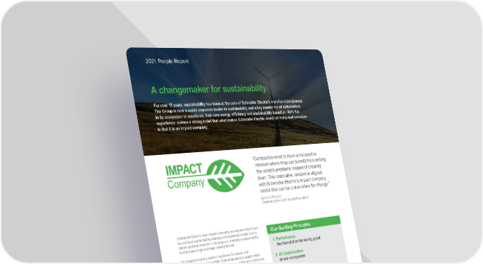 www.se.com Schneider Electric 2 2021 People Report 2021 People Report IMPACT Company A changemaker for sustainability For over 15 years, sustainability has been at the core of Schneider Electric’s transformation journey. The Group is now a world corporate leader in sustainability and a key enabler for all stakeholders in its ecosystem to accelerate their own energy efficiency and sustainability transition. With this experience, comes a strong belief that what makes Schneider Electric stand out today and tomorrow is that it is an impact company. Schneider Electric is an impact company, a company which lives by a unique sustainability strategy and operating model, built to deliver positive impacts in the long-run. It entails a responsibility to share learnings and keep raising the bar. An impact company seeks to address the needs of all stakeholders in its ecosystem, from employees to supply chain partners, customers, as well as local communities and institutions. To deliver sustainability in its entire value chain, it must combine a solid profitability with leading practice on all Environmental, Social and Governance dimensions. It means that an impact company has inherently aligned and integrated its purpose and its business mission to ensure its corporate value delivers on sustainability needs and ambitions. The company’s operating model is set up to impact on all of the above at global and local levels. Its culture builds on strong and practiced values with the right talent and processes to be a leading purpose-led company. An Impact model recognized in external ratings 1. Performance the foundation for doing good 2. A ll Stakeholders in our ecosystem 3. A ll ESG dimensions 4. Business digital partner for Sustainability and Efficiency 5. M odel & Culture set up for global and local impact Our Guiding Principles “ Co mpanies need to have a net positive mindset where they can benefit from solving the world’s problems instead of creating them. This restorative mindset is aligned with Schneider Electric’s impact company model that can be a true driver for change.” Bertrand Piccard Chairman of the Solar Impulse Foundation