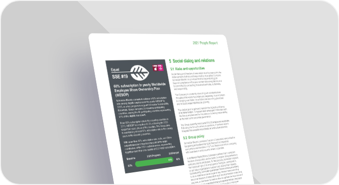 23 Life Is On | Schneider Electric www.se.com 2021 People Report 60% subscription in yearly Worldwide Employee Share Ownership Plan (WESOP) Schneider Electric commits to achieve a 60% subscription rate among eligible employees in the yearly WESOP by 2025, as a key program to support Schneider Sustainability Essentials. Scope concerns 29 recurring participating countries, among the 40 participating countries representing 91% of the eligible headcount. From 53% subscription rate in the recurring countries in 2019, WESOP has reached 60.5% achieving the 2025 target four years ahead of the deadline. The Group aims to maintaining at least 60% subscription rate in the coming years in the recurring countries. With more than 80% subscription rate, India, and China outperformed and have become part of the major contributors of the 2021 capital increase, representing together more than one-quarter of 2021 total subscription. Equal SSE #19 60% 53% Baseline 2025 target 2021 Progress 0 100 61% 5 S ocial dialog and relations 5.1 R isks and opportunities Social dialog and freedom of association must be seen within the wider context of ethics and responsibility. As a global Company, Schneider Electric is convinced that its responsibility goes beyond compliance with local and international regulations and is committed to conducting its business ethically, sustainably, and responsibly. The Company is constantly interacting with all stakeholders throughout the world: its borders are expanding, its environment is changing ever faster, its activities are becoming globalized, and its social responsibilities are growing. The challenge is to gain and maintain the highest confidence of its stakeholders. To support each employee in this approach, the Group emphasizes the importance of placing responsibility at the heart of its corporate governance. The Group currently has around 128,000 employees worldwide. Following the Group’s various acquisitions, it has been able to integrate this exceptional professional and cultural diversity. 5.2 G roup policy Schneider Electric considers freedom of association and collective bargaining as fundamental rights that must be respected everywhere and therefore in its Trust Charter commits to complying with local laws in every country where it operates. In its Human Rights Policy, Schneider confirms that it considers freedom of association as the basis of a regular dialog between a company and its employees. To that purpose, Schneider respects the individual right of its employees to freely join, participate in, or quit labor organizations to assert and defend their interests. Subsequently, Schneider guarantees that any employee wishing to do so shall be protected against any internal measure limiting his or her freedom of association such as discrimination of any kind, pay loss, or dismissal. Schneider also recognizes the importance of dialog with freely appointed employee representatives, employee representative bodies (such as Works Councils or employee forums), or organizations (like trade unions) and supports collective bargaining. In addition, Schneider joined the Global Deal initiative in 2017. The Group is promoting social dialog as a means to foster decent work, quality jobs, increased productivity and, by extension, greater equality and inclusive growth.