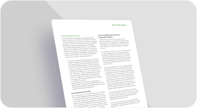 11 Life Is On | Schneider Electric www.se.com 2021 People Report Race and ethnicity in the US In the United States, the past couple years have driven strong visibility on racial and social injustices. Schneider Electric USA has committed to evolving the racial and ethnic diversity of its employee population, with specific representation targets in place. Schneider Electric USA continues to be a proud member of the National Society of Black Engineers (NSBE) Board of Corporate Affiliates (BCA), which provides recruitment, development, exposure, and leadership opportunities for its employees. To further accelerate progress, Schneider Electric USA launched a Racial Equity Task Force in June 2020. Under the stewardship of the Task Force, several projects have been developed in 2020/2021: • A s ounding board team was created, examining how frontline manager hiring decisions are made and whether biases exist that create barriers to advancement for Black professionals; • T he employee-led Diversity, Equity, and Inclusion task force worked on examining the current perceptions and experiences of diverse groups through quantitative and qualitative measures; • T he Psychological Safety task force team identified a need for a “Safety Zone,” a safe and confidential space to support employees on topics impacting their psychological safety (racism, microaggressions, inequities, mental health, etc.). The “Safety Zone” will be implemented into a new US benefit for all US employees in 2022. • S chneider Electric USA debuted partnerships with two Historically Black Colleges & Universities (HBCUs), Tennessee State University and North Carolina A&T University, with the goal of hiring more diverse early-career talents. 2.4.3 G enerational diversity For the five generations working at Schneider, the aim is to foster life-long career development and knowledge exchange for and across all generations to boost learning and innovation. Schneider is committed to creating new opportunities for the next generation (through, among other things, apprenticeships, internships, as well as its annual global student contest, Schneider Go Green in the City) and to harnessing the power of all generations, through tailored career development opportunities offered for each career stage (career week, coaching, development plans, reverse mentoring, etc.). Generation breakdown 36% 47% 10% 7% G en Y (Millennials) G en X B aby Boomers G en Z 2.4.4 A ccessibility and inclusion for People with disabilities Schneider Electric is strongly committed to the inclusion of people with disabilities. In January 2021, Schneider Electric joined the International Labour Organization (ILO) Global Business and Disability Network and signed their charter, committing to promote and include people with disabilities throughout their operations worldwide. In October 2021, in line with its commitment to digital accessibility, the Company debuted a new, more accessible version of its official website. In December 2021, in honor of the International Day of People with Disabilities, Schneider Electric organized a week-long global awareness campaign on the topic of disability and accessibility, educating employees about the diversity of disabilities and the actions allies can take to build an inclusive environment for all. At Schneider Electric France, overall, employees with disabilities account for 5.25% of the direct workforce (as of end of 2020). Schneider Electric France worked closely with a diverse panel of partnerships to develop the employment of disabled people, internally and externally, including targeted schools or universities in order to develop the visibility of professional opportunities to young talents with disabilities. In 2021, the Company remained committed to the recruitment of people with disabilities, with the addition of 24 new apprentices and 11 new permanent workers. Schneider Electric France keeps a strong focus on raising awareness of invisible disabilities including cognitive disabilities and chronic diseases. The awareness campaign includes webinars, educational materials as well as specific web series. A new Agreement on People with Disabilities has been signed with unions in December, giving means and objectives for 3 years focused on more recruitments (100 in 3 years), more accessibility (physical and digital) and more collaborative actions to allow employees facing health issues to work. To facilitate better communication in the context of the pandemic, all employees with hearing disabilities as well as their co-workers are still fitted with “inclusive masks” that allow visibility of the lower face. 2.4.5 L GBT+ inclusion In March 2018, Schneider Electric committed to the United Nations Free and Equal Standards of Conduct for Business on Tackling Discrimination against Lesbian, Gay, Bi, Trans and Intersex People, standing up for equal rights and fair treatment for LGBT+ people everywhere. By adopting these standards, the Group pledges to respect and stand up for the human rights of LGBT+ workers, customers, and members of the public; to support our LGBT+ employees and to prevent discrimination, including workplace discrimination, against LGBT+ people. In June 2019, during Pride Month, the Company announced the launch of its global LGBT+ Employee Resource Network (ERN): Schneider LGBT+ and Allies. The Group is open to all – LGBT+ people and allies alike – with an interest to further inclusion in the workplace. In October 2020, in addition to its (virtual) celebration of Pride Month, Schneider Electric held its first global LGBT+ Awareness Month. Each week, video testimonials, podcasts, and educational materials were provided to all employees interested in learning and hearing from their LGBT+ colleagues. In June 2021, the Company celebrated Pride Month globally, with a campaign that focused on the concept of intersectionality.