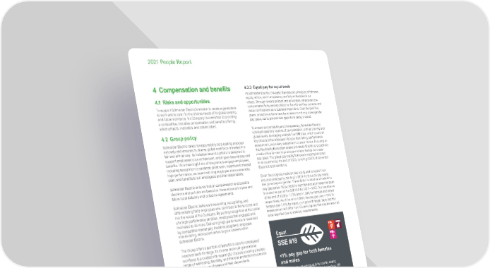 www.se.com Schneider Electric 20 2021 People Report 4 C ompensation and benefits 4.1 R isks and opportunities To support Schneider Electric’s mission to create a great place to work and to cater for the diverse needs of its global existing and future workforce, the Company is committed to providing a competitive, inclusive compensation and benefits offering, which attracts, motivates, and retains talent. 4.2 G roup policy Schneider Electric takes its responsibility as a leading employer seriously and ensures its diverse global workforce is treated in a fair and ethical way. Its inclusive reward portfolio is designed to support employees to be at their best, and it goes beyond pay and benefits. It’s a meaningful mix of programs to engage employees, including recognition to celebrate great work, incentives to reward high performance, an award-winning employee share ownership plan, and benefits to suit employees and their dependents. Schneider Electric ensures that all compensation and benefits decisions and policies are based on these above principles and follow local statutory and collective agreements. Schneider Electric believes in rewarding, recognizing, and differentiating fairly employees who contribute to the success and live the values of the Company. By putting recognition at the center of a high-performance ambition, employees feel engaged and motivated to do more. Delivering high performance is rewarded by competitive market pay, incentive programs, employee shareholding, and opportunities to grow careers within Schneider Electric. The Group offers a portfolio of benefits to care for employees’ needs at each life stage. Its diverse and multi-generational workforce is provided with meaningful choices covering a holistic range of well-being, flexibility, and financial protections to provide peace of mind to employees and their dependents. 4.3 Compensation 4.3.1 O ur job architecture and compensation process The Company has implemented a global job architecture to support HR processes and programs and to enable Schneider Electric to engage, develop, and move talents across different businesses and geographies. The job architecture provides alignment to market practice and organizational structure to ensure the reward package offered for a role is fair and competitive. This helps working towards creating greater transparency for career development and progression. 4.3.2 P ay competitively and pay-for-performance Schneider Electric employees are empowered to receive ongoing feedback, recognition, and coaching from their managers, and their individual performance is assessed in a fair manner based on their goals and behaviors. In line with the Group’s pay-for- performance philosophy, the compensation structure typically includes fixed and variable (incentive) elements. Compensation programs and decisions are based on individual performance and behaviors, Company performance, and competitive market positioning. 4.3.3 E qual pay for equal work At Schneider Electric, the basic foundational principles of fairness, equity, ethics, and transparency are fully embedded in our values. Through reward policies and processes, employees are compensated fairly and equitably for the skill set they possess and value contributions as a business imperative. Over the past five years, proactive actions have been taken to not only close gender pay gaps, but to prevent new gaps from being created. To ensure accountability and transparency, Schneider Electric conducts quarterly reviews of compensation, both at country and global levels, leveraging analysis from HR data, which covers all key drivers of the employee lifecycle from hiring, performance assessment, and salary adjustment to career moves. Focusing on this Pay Equity Ecosystem allows Schneider Electric to proactively create offers for new hires and promotions that do not create pay gaps. The global pay equity framework was implemented in all countries by the end of 2020, covering 99.6% of Schneider Electric’s total workforce. Given the progress made on pay equity and to support our inclusion philosophy, starting in 2021 the focus on pay equity has gone beyond gender. The ambition to attain and maintain a pay gap below 1% by 2025 for both females and males has been included as part of the SSE #18 for 2021 – 2025. Our baseline as of the end of 2020 is -1.73% and +1.00% for females and males respectively. As of the end of 2021, the pay gap was -1.61% for females and 1.11% for males, on track with target. Note that this measurement will differ from Country figures that may be required to be reported due to statutory requirements. <1% pay gap for both females and males A dedicated Pay Equity budget by country during salary review, education and training for leaders, HR and managers to create awareness of and eliminate unconscious biases, and established governance at the country level for HR and leaders to review progress have been put in place to facilitate the attainment of our ambition to achieve pay gaps of <1% for both females and males. Equal SSE #18 <1% <1% -1.73% 1.00% Baseline Female Male 2025 target 2021 Progress 0 100 -1.61% 0 100 1.11%