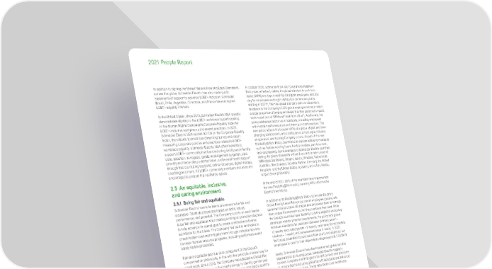 www.se.com Schneider Electric 12 2021 People Report In addition to signing the United Nations Free and Equal Standards, across the globe, Schneider Electric has also made public statements of support to advance LGBT+ inclusion: Schneider Brazil, Chile, Argentina, Colombia, and France have all signed LGBT+ equality charters. In the United States, since 2019, Schneider Electric USA proudly demonstrates allyship to the LGBT+ workforce by participating in the Human Rights Campaign’s Corporate Equality Index for LGBT+-inclusive workplace policies and practices. In 2022, Schneider Electric USA scored 90/100 on the Corporate Equality Index, the nation’s foremost benchmarking survey and report measuring corporate policies and practices related to LGBT+ workplace equality. Schneider Electric USA offers benefits to support LGBT+ community members including fertility and infertility care, adoption, surrogacy, gender reassignment surgeries, paid primary and secondary parental leave, and mental health support through free counseling sessions, online resources, digital therapy, coaching and more. All LGBT+ community members and allies are encouraged to present their authentic selves. 2.5 A n equitable, inclusive, and caring environment 2.5.1 B eing fair and equitable Schneider Electric wants its talent processes to be fair and equitable. Talent decisions are based on skills, values, performance, and potential. The Company counts on each leader to be fair and equitable when making a hiring or promotion decision to help advance its overall goal to create a skilled and diverse workforce for the future. The Company has built in reminders to check hidden bias and mitigate them through inclusive tips into its major human resource programs, including performance and salary review processes. Fair and equitable pay is a core component of the Group’s compensation philosophy, in line with the principle of equal pay for equal work. Since 2015, the Company has adopted a Global Pay Equity Framework – a global methodology to identify gender pay gaps within comparable groups of employees and lead a country- driven approach to address gaps with appropriate corrective actions. With the help of this Framework, Schneider Electric has committed to reaching <1% pay gap for both females and males by 2025. As of end 2021, the pay gap was -1.61% for females and 1.11% for males, on track with target. 2.5.2 M anaging our unique lives and work New Ways of Working Schneider Electric wants all employees to be able to manage their unique lives and work in the way that works best for them and has implemented several policies to this end. In October 2020, Schneider Electric’s Global Flexibility@Work Policy was refreshed, making it a global standard to work from home (WFH) two days a week for all eligible employees, and one day for employees working in distribution centers and plants, starting in 2021 (1) . The new global standard came in response to feedback in the Company’s 2020 global employee survey in which a large proportion of employees stated that they preferred a hybrid work model (mix of WFH and “work from office”). Additionally, the policy addresses hybrid work holistically, providing employees with mental health resources and training on best practices. This new policy reflects the broader shifts of a global, digital, and ever- changing environment, and contributes to a more agile, inclusive, empowered, and trusting Company culture. As part of this new Flexibility@Work Policy, countries can explore additional measures such as flexible working hours, flexible holidays, part-time work, and volunteering. Some examples of Schneider Electric countries raising the global standards with no fixed limit on the number of WFH days are Estonia, Finland, Latvia, Lithuania, Netherlands, Australia, New Zealand, Slovakia, Russia, Germany, the United Kingdom, and the United States, operating with a fully flexible, output driven philosophy. At the end of 2021, 99% of the countries have implemented the new Flexibility@Work policy covering 88% of Schneider Electric’s workforce. In addition to its Flexibility@Work Policy, Schneider Electric’s Global Family Leave Policy supports all employees globally with personal time at critical life stages and empowers them to manage their unique life and work so that they can be at their best. While the Group’s countries have flexibility to define eligibility and policy details per statutory/market requirements, the policy sets global minimum standards for paid parental leave (primary parent – 12 weeks, secondary parent – 2 weeks), care leave (for sick/elderly relatives – 1 week); and bereavement leave (1 week). In 2020, the Group expanded its care leave from one to two weeks for our employees to care for their dependents diagnosed with COVID-19. Lastly, Schneider Electric has also implemented global benefits standards for all its employees. Schneider Electric regularly reviews compliance with its global benefit policies and principles to ensure that its inclusive global benefit standards are delivered for everyone, everywhere. These standards cover healthcare, family leave, and life cover. 2.5.3 P romoting well-being and mental health Well-being in our DNA Well-being has been a strategic priority since 2015. Schneider Electric’s well-being ambition is to create an environment where employees are empowered to manage their unique life and work by making the most of their energy. (1) E ligibility is based on employee’s role and requirements for on-site work and is determined by country/territory with additional input from managers. Some essential roles, e.g., Plant & Distribution Center blue-collar workers, Field services engineers due to role specifications are excluded from this 2-day work-from-home policy. Recognizing that many critical roles need to be on site, this policy was adjusted to 1 day for the eligible Plant & Distribution Center specific roles.