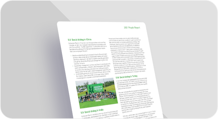 25 Life Is On | Schneider Electric www.se.com 2021 People Report 5.8 So cial dialog in China Schneider Electric China has over 30 legal entities and more than 100 sites. In 2021, the Company fostered active social dialog with joint Group efforts. The HR department, in partnership with unions, facilitate active dialog with employee representatives on topics that cover employee lifecycle: • M obile-enabled learning is extended to both office and plant workers, while virtual and on-site blended training with action learning is deployed in all talent programs ensuring generation and gender diversities. Employee average learning time has reached 18 hours. • L eadership management continuously listens to employees with open communication, reflection, and action plans. Well-being bi-monthly live talks have attracted over 3,000 participants; topics cover mental health, stress management, parenting, etc. • S ustainability practices are promoted through various events, for instance, Zero Carbon Run to increase carbon neutral knowledge and corporate commitments awareness. 5.9 So cial dialog in India Schneider Electric India has a strong culture of social dialog with all employees, unionized and non-unionized. In 2021, Schneider Electric India maintained engaging in equitable industrial relations across its plants and associated establishments. Industrial harmony has been achieved through a time-tested collective bargaining process involving unions or through worker representative committees. In some of the plants where there are no recognized unions, this bargaining process is conducted with elected employees on committees such as Welfare (Works Committee). There is also strong engagement with other committees like Health & Safety, Canteen, Sports, and Transport, including a special committee for women employees and a prevention of sexual harassment committee (fully compliant with the prevention of sexual harassment governance as per local laws), duly represented by employees and external women with specialist knowledge of the subject and with legal backgrounds. These committees provide a platform for employees to represent their concerns, collective grievances, and workplace-related issues to the management. All employee engagement programs are run through these committees with the active participation of every employee. The process of social dialog also includes monthly employee communication at plants level, as well as through Quarterly Town Hall communication on Company performance, strategy, and challenges. Special sessions were organized for employees’ family members on the world standard safety procedures at the workplace which boosted confidence and encouraged employees to return to work. To drive positive mental well-being, the Company leveraged the existing Employee Assistant Program (Saathi) for employees and family members, which became a huge support system. Experienced doctors and specialists facilitated COVID-19 safety and mental health sessions. Employees regularly connected with counsellors, read articles on relevant health topics, and attended webinars to augment their health preparedness. Employees were regularly involved in social and environmental protection initiatives through large scale tree plantation drives across the factory and at nearby locations. Campaigns on virtual engagement and collaboration, and leaders connecting in formal and informal settings, further ensured that a physical and psychologically safe environment for employees was created. 5.10 So cial dialog in Turkey In 2021 the Company saw great benefits from the policies that were deployed in 2020. All COVID-19 actions continued to be followed systematically and more digitally by Health Safety & Environment and HR, and updated information was regularly shared with all employees. This year, Schneider Electric successfully renewed the union agreement which covers nearly 650 employees without any dispute. With this agreement, the private health insurance scope has been extended, and not only the employees but also the families have been taken under the coverage. Digital learning, which has been a priority for many years, was further encouraged during this time. The Digital Learning Corner project has been completed so all shop-floor employees can access digital learning, with a wide range of topics available from Schneider Essentials learning offer to digital technology trends, Lean Digitization Systems, and more. 2020 also, unfortunately, saw a serious forest fire in much of Turkey, especially the Aegean region. Schneider Electric and employees came together and provided support to the region. In 2021, Schneider Electric supported the project, which was initiated under the leadership of Bogaziçi University Climate Center and United Nations Sustainable Development Solutions Networks – SDNS Turkey, for the training of teachers within the scope of Turkey’s Climate Mobilization. Within the scope of the “Climate 2030: Special Education for Educators on Climate Change” project, it is aimed to inform about the basic concepts of climate change, its physical foundations, the reduction and adaptation dimension of climate change, its international processes, and sustainable climate actions. Istanbul innovation hub started to co-operate with selected universities in Turkey, giving young people the opportunity to see the digital solutions in energy management and the latest technologies applied by the Company, to expand their vision.
