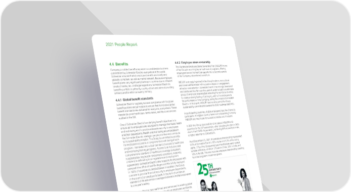 www.se.com Schneider Electric 22 2021 People Report 4.4 Benefits Company provided benefits represent a considerable business commitment by Schneider Electric everywhere in the world. Schneider ensures that all employee benefits are locally and globally compliant, as well as market relevant. Because employee benefit plans vary significantly between countries due to different levels of social, tax, and legal regulations, Schneider Electric’s benefits portfolio is primarily country-driven and aims at providing similar benefits within a country territory. 4.4.1 G lobal benefit standards Schneider Electric regularly reviews compliance with its global benefit policies and principles to ensure that its inclusive global benefit standards are delivered for everyone, everywhere. These standards cover healthcare, family leave, and life cover and are audited in the SSI. One of Schneider Electric’s underlying benefit objectives is to ensure all its employees are equipped to manage their basic health and well-being and to provide adequate security to employees and their dependents. Health and well-being are embedded in the Schneider Electric strategic people priorities and contribute to its sustainability mission. The Group is committed to provide its employees access to a comprehensive well-being at work program – translated into a dual standard of access to healthcare and well-being training programs. Access to an inclusive and comprehensive standard of healthcare coverage (outpatient, hospitalization, key health risks/chronic conditions, maternity, children) is defined by local regulations and employment agreements. Schneider Electric also supports its employees with personal time off at critical life stages and this is fully deployed in 100% of countries as detailed below. In addition, the Group commits to provide financial security to employee dependents, in the event of an employee’s death, in the form of a minimum standard of life assurance coverage of at least a multiple equivalent to one year’s salary. Schneider Electric has reaffirmed and enhanced its existing global benefit standards outlined above for all our employees worldwide, for the duration of the COVID-19 crisis. This included a global extension of care leave from one to two weeks for our employees to care for their dependents diagnosed with COVID-19. Global Family Leave Policy As part of being a caring and responsible employer, Schneider Electric launched its global family leave policy along with care leave in 2017. With its industry-leading Global Family Leave Policy, Schneider Electric supports employees with personal time at critical life stages and empowers everyone to manage their “unique life and work” so that they can be at their best. While the Group’s countries have flexibility to define eligibility and policy details per statutory/market requirements, the policy sets global minimum standards: • F ully paid parental leave (primary parent – 12 weeks, secondary parent – 2 weeks); • C are leave (for sick/elderly relatives – 1 week); and • B ereavement leave (1 week). All benefits eligible employees have access to this global policy. 4.4.2 E mployee share ownership The Worldwide Employee Share Ownership Plan (WESOP) is one of the Group’s recurring key annual reward programs, offering employees across the world an opportunity to become owners of the Company, at preferred conditions. WESOP is strongly ingrained in the Group’s culture, as a cultural and reward differentiator with a positive impact on engagement, attraction and retention. Schneider Electric has strongly developed and reinforced its offer over the years in order to build a sustainable group of employee shareholders reflecting the workforce diversity, to create a strong feeling of belonging, and to link employees to the performance of the Company, acting like owners of Schneider Electric. In that spirit, WESOP has become part of the Group sustainability commitments towards its 2025 roadmap (SSE #19). In participating countries, eligible employees have the chance to participate. All eligible country teams are collaborating to deploy WESOP and they made its success possible over the years. In 2021 the Group successfully reintroduced WESOP in 40 countries for the 25 th anniversary, after cancelling the plan in 2020 due to the COVID-19 pandemic, achieving 59% subscription rate, a higher rate than in 2019 at 50%. As of December 31, 2021, the employee shareholding represented 3.6% of Schneider Electric SE’s capital and 6.3% of the voting rights. 77% of the Group employee shareholders were located outside of France, of which 13% are in China, 15% in India, and 10% in the US. This also includes employee shareholding resulting from the long-term incentives grants.
