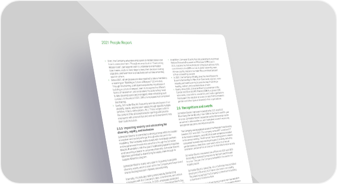 www.se.com Schneider Electric 14 2021 People Report • F irst, the Company educates employees on hidden biases and how to overcome them. Through an e-workout on “Overcoming Hidden bias”, participants learn to understand what hidden bias means, explore clear steps to keep their decision-making objective, and learn how to proactively call out bias when they see it in others. • S ince 2021, all employees are also required to take a mandatory e-learning on “Building a Culture of Respect” (30 minutes). Through this training, participants explore the importance of building a culture of respect, learn to recognize the different forms of harassment, and understand the actions they need to take (as employees and managers) when witnessing such conduct. At the end of 2021, 98% of employees had completed this training. • L astly, Schneider Electric frequently reminds employees of our diversity, equity, and inclusion values through specific nudges (articles, videos, white papers, etc.). These nudges build on the content of the aforementioned e-learnings and provide employees with practical tips and real-world examples to help them build inclusion. 2.5.5 I mpacting society and advocating for diversity, equity, and inclusion Schneider Electric is committed to driving change within its broader ecosystem and society at large, through advocacy and role- modelling. The Company works closely with its strategic partners and suppliers and invests in local actions through the Schneider Electric Foundation, with the goal of addressing systemic inequities and becoming a leader in corporate citizenship. Schneider Electric USA has committed to diversifying its supply chain through its Supplier Diversity program. Schneider Electric is also very open in its journey to progress diversity, equity, and inclusion within the Company and beyond and shares its progress both internally and externally. Internally, this includes raising awareness by familiarizing employees with the Company’s data, commitments, and various partnerships and initiatives. In 2021, employees celebrated International Women’s Day, Pride Month, International Men’s Day, and Global Mental Health Day, and led awareness campaigns for LGBT+ inclusion and accessibility for people with disabilities. Schneider Electric is also engaged in various partnership to be an agent of change within the private sector and beyond: • I n May 2021, Schneider Electric renewed its long-standing partnership with United Nations Women through the newly launched Generation Equality Forum (GEF). The GEF is a global multi-stakeholder initiative that brings together representatives from the private sector, Member States, United Nations Entities, and civil societies, including youth organizations and networks, to accelerate progress for gender equality around the world. As part of the GEF “Economic Justice and Rights” Coalition, the Company has committed, through the Schneider Electric Foundation, to support the training of 5,000 women in the energy trades and their self-employment or access to jobs, through specialized partnerships, and to launch two new international initiatives to train and empower women in the energy field by end 2022. As part of the “Feminist Movements and Leadership” Coalition, and in alignment with its SSI 50/40/30 target, Schneider has committed to reach 45/29/26; that is, women representing 45% of its new hires, 29% of its frontline managers, and 26% of its leaders by the end of 2022. • I n addition, Schneider Electric has also committed to the United Nations Women’s Empowerment Principles (WEPs) and in 2019, became the first multinational company to achieve 100% commitment to the WEPs across its global leadership team. All new country leaders now make this commitment as part of their onboarding process. • I n 2021, the Company officially joined the World Economic Forum’s Partnership for New Work Standards; a global, cross- industry partnership aiming to pave the way in building a healthy, resilient, and equitable future of work. • L astly, since 2020, Schneider Electric is a member of the Gender and Diversity KPI Alliance (GDKA), a group of DEI advocates, corporations, academics, and trade organizations that support the adoption and use of a set of KPIs to measure gender and other types of diversity in their organizations. 2.6 R ecognitions and awards Schneider Electric has been included in the 2021 and 2022 Bloomberg Gender-Equality Index (GEI) for the fourth and fifth year in a row. Schneider Electric scored above the GEI average overall as well as in data excellence, with the highest scores in equal pay and gender pay parity, and inclusive culture. The Company was recognized as part of the Financial Times Diversity Leaders 2021 and 2022. The company ranked 66 th overall and 5 th in its industry category, out of 850 European companies included in the annual ranking. This Financial Times ranking aims to assess companies’ success in promoting all types of diversity, including gender balance, disabilities, openness to all forms of sexual orientation, and an ethnic and social mix that reflects wider society. Schneider Electric was named one of Fortune’s 2021 and 2022 World’s Most Admired Companies for the fourth and fifth year in a row. This year, the Company ranked #3 in the electronics industry sector. Schneider Electric ranked No. 48 on the Forbes America’s Best Employers in Diversity 2021 list and the best in our industry. The award recognizes the Company’s commitment to building a diverse and inclusive culture. Schneider Electric’s Gulf well-being program won two awards in 2021: Best workplace wellness program and happiest workplace – private sector; based on the well-being, diversity, equity, and inclusion, and sustainability team initiatives. This brings Schneider Middle East to a total of seven awards in the well-being sector since 2 017. Schneider Electric Mexico has won, for the tenth time in a 