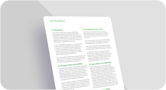 www.se.com Schneider Electric 24 2021 People Report 5.3 Governance Social dialog is managed at country level by the HR leaders with the employee representative bodies and unions, and at transnational level with the European Works Council (EWC) which covers most of geographical Europe. Social dialog is also taken into consideration by the Group’s social reporting system, where local HR teams report on the presence of trade unions, works councils, and the Health and Safety Committee every year. In 2014, while changing the corporate form of its parent company, Schneider Electric SA, into a European company (Société européenne), Schneider Electric negotiated an agreement with employee representatives of European countries about the involvement of these countries’ employees in the Company’s decision-making processes, thus reaffirming its commitment to promoting social dialog at international level. Labor relations within Schneider Electric are based on respect and dialog. In this spirit, management, and employee representatives meet regularly to exchanges views, negotiate, sign agreements, and ensure that agreements are being implemented. 5.4 E uropean Works Council (EWC) The changes that were made in 2014 to the EWC in the framework of Schneider Electric SA’s transformation into a European company significantly enhanced the intensity and the impact of social dialog at European level. This European channel for dialog aims at enabling management to make more efficient decisions by giving employee representatives the opportunity to be informed of such decisions and to understand their reasons, as well as to put forward proposals to supplement or improve them. It has also fostered the emergence of a strong identity, combining different cultures and having the common aim of working towards social and economic progress within the companies in the Group at European level. The EWC covers all European Economic Area countries (hence all EU member states) and Switzerland, for a total of 43,000 employees. In 2017, Schneider Electric and IndustriAll Europe signed an innovative Europe-wide agreement, the European agreement on the anticipation and development of competencies and employment with respect to the Schneider business strategy. This agreement is a great opportunity to create a governance for jobs and skills at the Company by anticipating impact and evolution in business in line with current market trends and the Company’s ambition. It sets clear objectives for boosting employees’ employability, and for enriching the workforce by diversity and digital generation recruitment and reinforces constructive social dialog at European and local level within the Company. Since the beginning of COVID-19 pandemic crisis, Schneider Electric has constantly increased its interactions with its employees and its representatives in order to contribute to helping create a stimulating work environment and participate in decisions aimed at improving the way we work and the need to adapt to our environment, all of which go hand in hand. For example, a new discussion space with EWC members has been set up to propose a collective improvement of the whistleblowing process. The digital June plenary session hosted presentations and discussions on the Company’s strategy with Executive Committee members including Schneider Electric’s Chairman & CEO. 5.5 G roup Works Council, France Schneider Electric is organized in France through more than 28 legal entities. However, with a coverage of 80% of employees, Schneider Electric Industries and Schneider Electric France SAS set the tone for social dialog in France mainly through the Group Works Council. In 2021, we continued to limit the impact of the COVID-19 pandemic on the business through our proven practice of social dialog, such as negotiations about the flexible working hours agreement. Several collective agreements were concluded with an objective to keep resiliency, strengthen Company performance, and at the same time maintain investments and employability of the workforce. To anticipate and manage the consequences of the evolution of Schneider Electric’s strategy over the next three years, a strategic workforce planning agreement was negotiated with the trade unions. Every year, Schneider Electric will discuss with its employee representatives the evolution of skills and workforce, including the opportunity to enhance its commitment on apprenticeship programs and others disruptive actions. 5.6 So cial dialog in the United States In the US, and more generally in North America, regular communication takes place with both union and non-union employees on key business topics and trends affecting their jobs. Company officials meet with key international union leaders and local union leadership on an ongoing basis, and formally on an annual basis, to advise and discuss competitive issues impacting the Company’s business, and to ensure alignment with the Company’s business strategies and challenges. In 2021, contract negotiations took place both locally and nationally resulting in successful contract ratification. Company officials have continued to partner with union representatives to discuss COVID-19 and ensure safety protocols are in place for employees, customers, and vendors. Recently, impact bargaining took place in November with union leaders regarding the Company’s “COVID-19 US Vaccination Policy” aligned with the federal mandate, Executive Order 14042. 5.7 So cial dialog in Mexico In Mexico, Schneider Electric leaders conduct regular communication with employees on topics related to their jobs; this communication takes place in different ways, including large communication meetings and small group conversations. There is also continuous communication with the union leaders and delegates of four national unions which represent unionized employees. Schneider Electric informs them of internal and external issues impacting the Company’s res