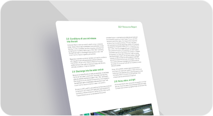 13 Life Is On | Schneider Electric www.se.com 2021 Resources Report 2.8 Conditions of use and release into the soil Schneider Electric sites are mainly located in urban or industrial areas. None of the Group’s businesses involve extraction or land farming. In 2021, Schneider manufacturing sites conducted their annual review of pollution risks as part of ISO 14001 monitoring. No significant spills or discharges were reported in 2021 with known harmful impacts regarding soil pollution. Hazardous materials are stored, handled, and used in compliance with regulations and with appropriate pollution protection mechanisms. As part of the ‘Waste-to-Resource’ program, additional focus is brought on hazardous waste, with efforts to eliminate, substitute, or improve treatment. 2.9 Discharge into the water and air Because Schneider Electric is mainly an assembler, its discharge into the air and water is very limited. Schneider manufacturing sites are carefully monitored, as part of ISO 14001 certification. Discharges are locally tracked as required by current legislation. No significant spills or discharges were reported in 2021 with known harmful impacts in terms of water or air pollution. Emissions of NO X and SO X and particles into the air are monitored at site level in accordance with applicable legal requirements; monitoring of these emissions is verified via ISO 14001 audits. Those emissions are not consolidated at Group level. Schneider Electric is committed to preventing adverse health and environmental impacts from Volatile Organic Compounds (VOC) emissions, and for this reason, the Group works to reduce VOC emissions from industrial activities by 10% every three years. VOC emissions are primarily linked to production. VOC emissions decreased from 29 kg/million EUR in 2017 to 17.4 kg/million Eur in 2021 (-40%). The Group engages with each of its industrial sites that contribute the most to VOC emissions, and which together concentrate over 90% of the Group’s VOC emissions, in a Pareto law approach. For these sites, environment, health and safety, and industrialization teams, join hands and actively collaborate to ensure conditions of use are strictly adhered to and health and environmental risks are known and mitigated. Those top VOC-emitting sites also investigate opportunities to reduce and phase-out concerned chemicals from industrial processes wherever possible. Finally, CFC and HCFC emissions are monitored locally, in accordance with applicable regulations. These emissions are mainly due to the operation of air conditioning systems and are not directly linked to Schneider industrial activities. These emissions are not consolidated at Group level. 2.10 Noise, odors, and light All Schneider Electric sites comply with local regulations on noise and odor. Given the nature of its activities and distribution model, Schneider does not have any significant light pollution externality.