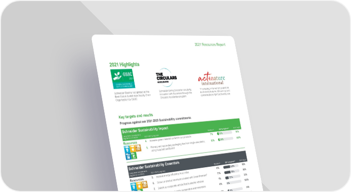 1 Life Is On | Schneider Electric www.se.com 2021 Resources Report 2021 Highlights Schneider Electric recognized as the Best Global Sustainable Supply Chain Organization by GSSC Schneider joining forces for circularity innovation with Accenture through the Circulars Accelerator program 1 st company in the world to publish its biodiversity footprint, followed by bold commitments to fight biodiversity loss Key targets and results Progress against our 2021-2025 Sustainability commitments Schneider Sustainability Impact Long-term commitments aligned to UN SDGs 2021-2025 programs Baseline (1) 2021 progress (2) 2025 Target Resources 4. Increase green material content in our products 7% 0 100 11% 50% 5. Primary and secondary packaging free from single-use plastic, using recycled cardboard 13% 0 100 21% 100% Schneider Sustainability Essentials Long-term commitments aligned to UN SDGs 2021-2025 programs Baseline (1) 2021 progress (2) 2025 Target Resources 5. Improve energy efficiency in our sites 0% 6.6% 15% 6. Grow our product revenues covered with Green Premium ™ 77% 78% 80% 7. Switch our corporate vehicle fleet to electric vehicles 1% 7.7 % 33% 8. Deploy local biodiversity conservation and restoration programs in our sites 0% 0% 100% 9. Give a second life to waste in ‘Waste-to-Resource’ sites 120 126 200 10. Avoid primary resource consumption through ‘take-back at end-of-use’ since 2017 (metric tons) 157,5 8 8 203,881 420,000 11. Deploy a water conservation strategy and action plan for sites in water-stressed areas 0% 9% 100% (1) Generally, the 2020 performance serves as a baseline for Schneider Sustainability Impact (SSI) and Schneider Sustainability Essentials (SSE) 2021-2025 programs. (2) Each year, Schneider Electric obtains a “limited” level of assurance from an independent third party verifier for all of the SSI and SSE indicators, in accordance with ISAE 3000 assurance standard (for more information, please refer to the Universal Registration Document). The 2021 performance is also discussed in more details in this report. Long-term roadmap 2030 • No net biodiversity loss in our direct operations by 2030 • 100% waste recovery by 2030