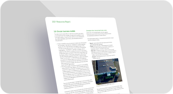 www.se.com Schneider Electric 20 2021 Resources Report 3.9 Circular business models The risks that Schneider Electric sees are around the perception of “one size fits all” for circularity, as well as the temptation to see it through a waste or recycling lens, and the focus on developing the related guidelines, governance, and standards based on this perception. • Product durability versus shorter-term waste loops: all resources are not equal in their thermal, mechanical, or electromagnetic profiles. For the industrial sector, the biggest impact of the circular economy will come from the promotion of reparability, upgradability, “retrofitability”, extension of lifespan, and of related “product second- and third-life services”. Schneider’s products are highly technical in nature with a long lifespan and are highly unlikely to end up as ocean plastic waste, yet a risk that the emerging regulations may be too “resource/waste- centric” can be seen. To meet quality and safety expectations, and adhere to stringent electric and electronic equipment standards, recycled materials are sometimes not available in either quantity and/or quality. The Group actively advocates sector-specific approaches. • Ensuring the safety of people and assets through qualified and certified services. Indeed, while promoting services to extend the products’ lifespan, Schneider grows the ranks of certified experts on its products (through thousands of Field Services Representatives). Leveraging the circular economy, there is a fantastic opportunity to enable more repair, retrofit, and recycling services, on condition that concerned product categories are adequately maintained and serviced by qualified and certified experts. There are opportunities to leverage the circular economies, both externally with customers and internally in operations. Schneider’s value propositions have long delivered resource efficiency, enabling customers to “do more with less”. Schneider’s deeply ingrained belief in the circular economy helps create a win-win-win-win ecosystem: good for the planet, good for customers (lower Total Cost of Ownership, lifespan of assets, etc.), good for the Company as a business (customer intimacy, stickiness, etc.), and good for its people (meaningful jobs, pride to take part in saving resources and energy, etc.). Through circular capabilities such as local models of reuse, retrofit, repair, refurbish, and take-back, and by unleashing the potential of IoT, connecting and digitizing products (predictive maintenance, performance optimization, leasing, pay-per-use, performance contracting), Schneider creates shared value for its customers. Most of Schneider’s new products are digital, connectable, ensure full product lifecycle management and predictive maintenance, and guarantee optimum performance, hence enabling the Group to move towards customer-intimate models like subscription, performance contracting, and leasing. The first focus, before considering end-of-life, is to prolong the lifespan of products. Those solutions, using up to 60% less materials than using brand new equipment, enable pull-through and constant payback, increase customer stickiness, and long- term relationships. Schneider’s first circular distribution center Since 2020, the Schneider Electric site in Bourguebus, France has supported the Group’s strategy to help accelerate its transformation towards the circular economy. Bourguebus helps deliver on 4 key aspects of Schneider’s circular economy strategy including: • Repack: repackaging of new Schneider products whose packaging has been damaged. • Reuse: sorting, selecting, redistributing never-energized Schneider products that are unsold and/or returned by our customers under the “Circular Certified” label. • Refurbish: managing the supply chain for collecting used Schneider products and sending them to the Schneider Electric Privas, France partner site for repair and managing customer orders on our second-hand web platform. • Recycle: dismantling of products to recover and resell the valuable materials. Schneider Electric’s Bourguebus site, France Bourguebus’s innovative circular economy transformation, along with the added value proposition of the “Circular Certified” label, has led to saving 4M€ of stock in 2021 and has avoided 950 tonnes of CO 2 e. In 2022, the site will continue to grow circular industrial capabilities to support business innovation and differentiating offers to customers. This includes capabilities such as refurbish, remanufacture and reverse logistics. One particular customer- centric project will include developing a website that will support the take-back of Schneider products at customer sites. External engagement Schneider Electric has been part of task forces on circular economy, playing leadership roles in multi-stakeholder dialogs. For example, the Group is active in France’s Circular Economy Roadmap and engaged in China with MIIT (Ministry of Industry and Information Technology) on circular strategy, leading AFEP, Gimélec, FIEEC, IGNES, and ORGALIM discussions for its sector on circular economy, publishing articles, and speaking at conferences (Greenbiz, Gartner, WEF, SCM World, peer-to-peer, EthicalCorp, and WindEurope, among others).