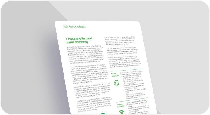 www.se.com Schneider Electric 4 2021 Resources Report 1 Preserving the planet and its biodiversity According to the Intergovernmental Science-Policy Platform on Biodiversity and Ecosystem Services (IPBES) global assessment report, biodiversity loss is unsustainable, and transformative changes are required to safeguard economic and social models. Major biodiversity loss undermines nature’s ability to support people and communities, a factor which strongly improves both quality of life and business prosperity. The fight against nature loss should be a business priority: nature is essential to global economic prosperity and individual business success. A sustainable future for people and economies will be possible if nature, climate, and people are addressed in an integrated way. Indeed, climate change is among the main drivers of biodiversity loss, and yet nature is part of the climate solutions. To engage in a transformative change, clear and measurable international targets, meaning counterparts to both the 1.5°C – 2°C increase climate limit and its associated carbon budget, must be defined. Schneider Electric supports the creation of ambitious biodiversity targets during the COP15 for Biodiversity. Schneider Electric calls for all companies to fast-track the adoption of ambitious biodiversity strategies, leveraging best practices from climate Science-Based Targets. In a joint effort with Marc Abadie, Chairman of CDC Biodiversité and Eva Zabey, CEO of Business for Nature, Schneider invites all companies to “raise corporate biodiversity ambition and aim at no net loss”. In addition to improving resource efficiency, it is also necessary in order to live within the limits of our planet to transform industrial processes and business models to move towards a circular economy. Circular economy is an obsession to avoid wastage and to reuse, repair, retrofit or recycle materials, maximizing environmental and financial value. A circular mindset also triggers process innovations and opens the door to new business models, enhancing customer intimacy and thus loyalty (e.g. take-back and modernization services). High hopes are placed on circularity as a state of mind, as it can transform multiple industries for the better. From a risk standpoint, some challenges may arise from a lack of stringent regulations or uncontrolled practices if used products come back into the loop without adequate controls and expertise, especially regarding life-critical products and electrical safety. Schneider Electric embraces circular principles all along the lifecycle of products and offers. The keystone of circularity is EcoDesignWay ™ , a process that is applied to the development of all new products. EcoDesignWay ™ enables the right trade-offs between the environmental impact along the lifecycle of products, allowing to coordinate the efforts over the whole value chain. Product innovation On product design, Schneider has committed to: • Phase-out potentially harmful substances and provide transparent information on environmental performance of products • Design with a circular mindset with Green Premium ™ , for increased durability, repairability and recyclability • Provide public and transparent information for the proper dismantling and end-of-life management of products • Increase green material content in products to 50% • 100% of its primary and secondary packaging is free from single-use plastic and uses recycled cardboard Process innovation In the manufacturing phase, the Group applies circularity principles in its operations and with customers: • Have 200 ‘Waste-to-Resource’ sites by 2025 to optimise waste generation and recycling on the Group’s sites • EcoStruxure ™ solutions help customers improve resource efficiency in industrial processes Business model innovation Over the lifecycle of offers, Schneider commits to innovate with circular business models and services: • Support customers to optimise asset lifecycle management for increased durability and efficiency, with Asset Performance Management (APM) services • Give a second life to products (unsold or obsolete stock, commercial returns), with the ‘circular certified’ label launched in France in 2020 • For specific product ranges such as products containing SF 6 , offer take-back and end- of-life management services. The Group is committed to avoid 420,000 metric tons of primary resource consumption through ‘take-back at end-of-use’ from 2017 to 2025