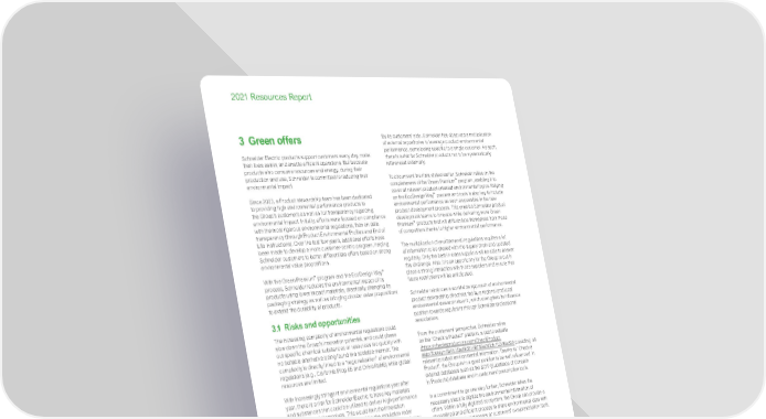 www.se.com Schneider Electric 14 2021 Resources Report 3 G reen offers Schneider Electric products support customers every day, make their lives easier, and enable efficient operations. But because products also consume resources and energy, during their production and use, Schneider is committed to reducing their environmental impact. Since 2003, a Product stewardship team has been dedicated to providing high environmental performance products to the Group’s customers as well as full transparency regarding environmental impact. Initially, efforts were focused on compliance with the most rigorous environmental regulations, then on data transparency (through Product Environmental Profiles and End of Life Instructions). Over the last few years, additional efforts have been made to develop a more customer-centric program, helping Schneider customers to better differentiate offers based on strong environmental value propositions. With the Green Premium ™ program and the EcoDesign Way ™ process, Schneider reduces the environmental impact of its products using lower impact materials, drastically changing its packaging strategy as well as bringing circular value propositions to extend the durability of products. 3.1 Risks and opportunities The increasing complexity of environmental regulations could slow down the Group’s innovation potential, and could phase out specific chemical substances or resources too quickly with no suitable alternative being found in a scalable manner. The complexity is directly linked to a “regionalization” of environmental regulations (e.g., California Prop 65 and China RoHS) while global resources are limited. With increasingly stringent environmental regulations year after year, there is a risk for Schneider Electric to have key materials and substances that could be utilized to deliver high performance to be regulated themselves. This would limit the innovation potential of products that would fall within the regulation radar with possible restrictions. There is also a risk to face contradictory recommendations due to regulations overlap (e.g., substances restriction versus circularity performance). By its customers’ s ide, Schn eider ha s observed a m ultiplication of e xternal r epositories t o leverage pr oduct en vironmental performance, some being specific to a single customer. As such, there is a risk for Schneider products not to be systematically referenced e xternally. To c ircumvent t he r isks s tated e arlier, S chn eider r elies on t he completeness o f the G reen P remium ™ pr ogram, ena blin g it to cover a ll r elevant pr oduct-oriented en vironmental t opics. R elying on the EcoDesign Way ™ process and tools is also key to include environmental performance as soon as possible in the new product de velopment pr ocess. T his ena bles S chneider pr oduct development t eams t o innovate w hile del ive ring m ore Green Premium ™ products t hat w ill d ifferentiate t hemselves f rom those of c ompetitors t hanks t o h igher en vironmental p erformance. The m ultiplication o f en vironmental r egulations r equires a l ot of information to be shared with the supply chain and updated regularly. Only the best-in-class suppliers will be able to answer this challenge. Also, it is an opportunity for the Group to put in place a s trong i nteraction w ith t hose s uppliers a nd ens ure that future restrictions will be anticipated. Schneider r einforces a wo rldwide a pproach o f environmental product stewardship directives fed by a regional and local environmental s teward ne twork, w hich s trengthen it s influence position t owards r egulators t hrough S chn eider pr ofessional associations. From t he customers’ p erspective, S chneider r elies on th e “Check a Product” platform, a public websit e (https://checkaproduct.se.com/CheckProduct . aspx?cskey=4b4b15ad9d8148759e39fcb1b346ad 9f) p roviding a ll relevant product enviro nmental information. T hanks to “Check a Pro duct”, the Group is in a good position t o be well referenced i n external databases such as the SCIP (Substa nce of Concern in Products) database and in customers’ prescription tools. In a c ommitment t o go o ne s tep f urther, S chneider t akes t he necessary steps to digitize the environmental information of offers. Within a fully digitized ecosystem, the Group can provide a streamlined a nd e fficient pr ocess t o share en vironmental d ata with external third-party databases or customers’ own prescription tools. RoHS: Restriction of Hazardous Substances. REACH: Registration, Evaluation, Authorization and Restriction of Chemicals. PEP: Product Environmental Profile. EoLI: End-of-Life Instructions. European Union adopts RoHS Green Premium introduced to provide transparent information on regulated substances and to share the environmental information of our products European Union adopts REACH EcoDesign Way launched our internal eco-design approach embedded in the offer creation process Upgraded Green Premium program to include green claim differentiation Enhanced environmental performance criteria Data Digitization acceleration RoHS RoHS PEP REACH EoLI REACH RoHS EcoDesign Way ™ 2003 2007 2008 2015 2018 2022