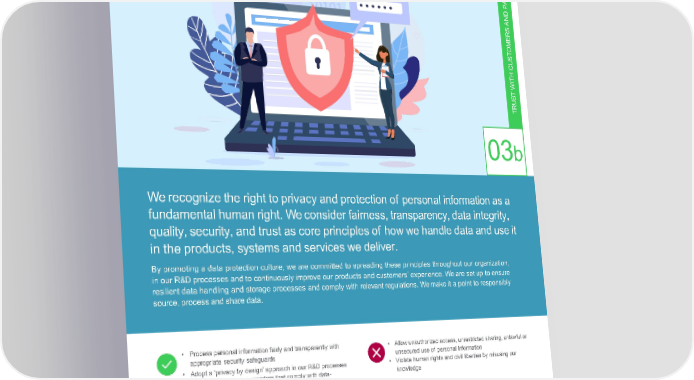 b) HonorDataPrivacyandProtection S ER N T PAR D AN RS E M O T CUS H T WI T S U TR 03b Werecognizetherighttoprivacyandprotectionof personalinformationasa fundamentalhumanright.Weconsiderfairness,transparency,dataintegrity, quality, security, and trust as core principles of how we handle data and use it in the products, systems and services we deliver. By promoting a data protection culture, we are committed to spreading these principles throughout our organization, in our R&D processes and to continuously improve our products and customers’ experience. We are set up to ensure resilient data handling and storage processes and comply with relevant regulations. We make it a point to responsibly source, process and share data. • Process personal information fairly and transparently with • Allow unauthorized access, unrestricted sharing, unlawful or appropriate security safeguards unsecured use of personal information • Adopt a ‘privacy by design’ approach in our R&D processes • Violate human rights and civil liberties by misusing our • Workwith suppliers or vendors that comply with data- knowledge protection requirements • Protect personal information and respect individuals’ rights • Runcompliance controls and implementation programs