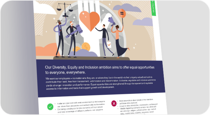 CreateEqual 02 Opportunities S M A TE D TE S U TR OurDiversity, Equity and Inclusion ambition aims to offer equal opportunities to everyone, everywhere. Wewantouremployees–nomatterwhotheyare,orwheretheyliveintheworld–tofeeluniquelyvaluedandsafeto contribute their best, free from harassment, victimization and discrimination. A diverse, equitable and inclusive workforce yields stronger innovation and performance. Equal opportunities are strengthened through transparent and equitable accesstoinformation and tools that support growth and development. • Foster an open and safe work environment so that everyone • Make assumptions about people or their intentions can share their perspective and authentically be themselves • Let biases drive decisions • Encourage employees to take ownership of their careers • Accept or allow intimidation, discrimination, or disrespect and take advantage of different platforms and programs • Tolerate degrading comments on race, sex, ethnic and to grow national origin, religion, political opinion, age, medical • Ensure equal pay for equal work and implement fair and status, marital status, disability, pregnancy, sexual equitable pay practices orientation, gender, or gender identity • Demonstrate inclusive behavior by identifying and addressing our own biases • Build and support a culture of respect and speak up when weseediscrimination or harassment of any kind