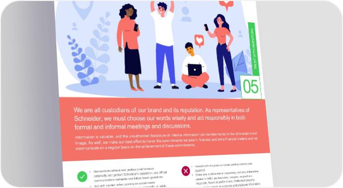 Preserveour Reputation S OR T S E V IN H T WI T S U TR 05 Weareallcustodiansof ourbrandanditsreputation.Asrepresentativesof Schneider, we mustchooseourwordswiselyandactresponsiblyinboth formal and informal meetings and discussions. Information is valuable, and the unauthorized disclosure of internal information can be detrimental to the Schneider brand image. As well, we make our best effort to honor the commitments we take in financial and extra-financial matters and we communicateonaregularbasisontheachievementof thesecommitments. • Demonstrate ethical and professional behavior • Interact with the press or speak publicly without prior externally and protect Schneider’s reputation, use official approval communication materials and follow brand guidelines • Share any confidential or proprietary company information • Act with caution when posting on social media related to R&D, pre-launches, mergers, acquisitions, • Avoid discussing confidential topics externally, in public disposals, financial performance, intellectual property, places internal documents or customer and employee information, • Respect confidential information by signing Non-Disclosure etc. Agreements(NDA) • Commenton financial performance or announcements • Take the right care in elaborating our commitments for future • Get involved in activities that could reflect negatively on financial and extra-financial performance, and make our Schneider best effort to deliver • Involve Schneider in our personal convictions and beliefs • Express our personal opinions about Schneider through official communication channels, such as social media • Disparage Schneider or our colleagues on online forums