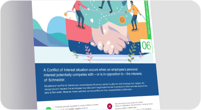 AvoidConflicts of Interests S ER N T PAR D AN RS E M O T CUS H T WI T S SU MTR A TE D TE S U 06 TR AConflict of Interest situation occurs when an employee’s personal interest potentially competes with –or is in opposition to –the interests of Schneider. Situations of conflict of interest can unconsciously influence a person’s judgment and challenge their integrity. We recognize and respect that employees may take part in legitimate financial, business and other activities beyond their jobs at Schneider. However, these activities cannot conflict with their responsibilities to Schneider. • Disclose potential, apparent or actual conflicts of interest • Hide information on any conflict of interests and comply with related mitigation actions • Debate or participate in internal decision-making processes, • Disclose involvement with, or financial stakes in any should a conflict of interest arise organization related to our competitors, customers or • Allow decisions or actions to be influenced by favoritism, suppliers, and explain how this allows us to influence nepotism or preferential treatment decisions in its favor • Help or work for our competitors • Participate to the yearly Conflict of Interest Disclosure • Engage in or have direct or indirect interests in any other Campaign when requested so activity, business or employment that interferes in any way • ConsultwithourEthicsDelegatesorHRBusinessPartners with our responsibilities and availability to Schneider in case of doubt
