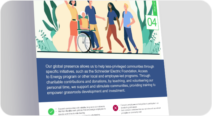 Empower S E I T LocalCommunities UNI M M CO H T WI T S U TR 04 Ourglobalpresenceallowsustohelpless-privilegedcommunitiesthrough specific initiatives, such as the Schneider Electric Foundation, Access to Energy program or other local and employee-led programs. Through charitable contributions and donations, by teaching, and volunteering our personal time, we support and stimulate communities, providing training to empowergrassrootsdevelopmentandinvestment. • Support communities with reliable, long-term commitments • Force any employees or third-parties to participate in, or • Maintain flexible work policies that encourage employees to donate to good causes devote work time to volunteering • Getinvolved in initiatives that are not in line with our ethical • Provide opportunities to devote time to volunteering, principles or community work community service and social causes