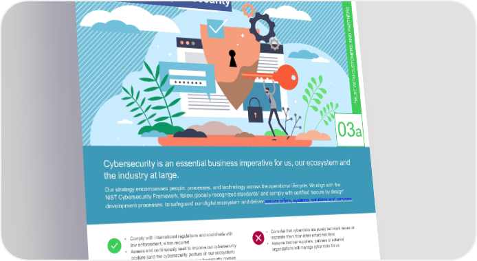 ReachtheHighestStandard for Cybersecurity, Data Privacy andProtection a) Excel at Cybersecurity S ER N T PAR D AN RS E M O T CUS H T WI T S U TR 03a Cybersecurity is an essential business imperative for us, our ecosystem and the industry at large. Ourstrategy encompassespeople,processes,andtechnologyacrosstheoperationallifecycle. Wealignwith the NISTCybersecurity Framework, follow globally recognized standards1 and comply with certified ‘secure by design’ developmentprocesses,tosafeguardourdigital ecosystemanddeliversecureoffers, systems, solutions and services. • Complywith international regulations and coordinate with • Consider that cyber risks are purely technical issues or lawenforcement,whenrequired separate them from other enterprise risks • Assessandcontinuously seek to improve our cybersecurity • Assume that our suppliers, partners or external posture (and the cybersecurity posture of our ecosystem) organizations will manage cyber risks for us • Help our customers to improve their cybersecurity posture enabling them to strengthen security protection and evaluate risks stemming from suppliers by applying defined standards and frameworks • Promote cybersecurity through trusted and transparent information sharing; provide support against cyber threats and attacks • Collaborate with cross-industry organizations2 to secure value chains and strengthen digital trust • Provide clear communication and public statements on Schneider and its ecosystem’s cybersecurity posture, if required