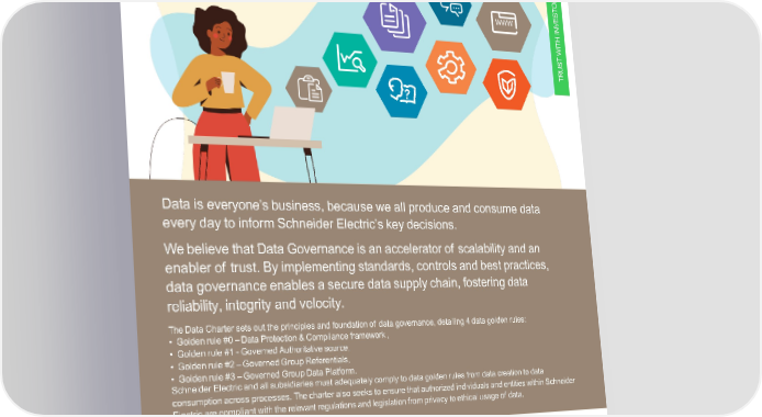Makeobjectivedecisions 06 usingtrusteddata S OR T S E V IN H T WI T S U TR Dataiseveryone’s business, because we all produce and consume data everydaytoinformSchneiderElectric’skeydecisions. WebelievethatDataGovernanceisanacceleratorof scalabilityandan enabler of trust. By implementing standards, controls and best practices, datagovernanceenablesasecuredatasupplychain,fosteringdata reliability, integrity and velocity. TheDataChartersetsouttheprinciplesandfoundationof datagovernance,detailing4datagoldenrules: • Goldenrule#0–DataProtection&Complianceframework, • Goldenrule #1 - Governed Authoritative source, • Goldenrule#2–GovernedGroupReferentials, • Goldenrule#3–GovernedGroupDataPlatform. SchneiderElectric and all subsidiaries must adequately comply to data golden rules from data creation to data consumptionacrossprocesses.The charteralsoseekstoensurethatauthorizedindividualsandentities withinSchneider Electric are compliant with the relevant regulations and legislation from privacy to ethical usage of data. • Apply the 4 Data Golden Rules to drive trust and scalability • Handle data without a clear understanding of its sensitivity – Apply the Data Protection & Compliance framework and without applying relevant data protection mechanisms – Useauthoritative data sources • Keepdata or records without checking data retention policy – Categorize data using Company Referentials • Usedatafor key decisions without considering traceability – Distribute data to approved SE data platforms only • Jeopardize accuracy and integrity of data by manipulating • Ensure that Performance Management is relying upon data sourced from Schneider Electric Data Platforms objective data • Think data is a topic for experts: data is everyone’s business • Skill up on Data Competencies, leveraging the Data & • Addressdatagovernanceonceasystem isalreadydeployed AI Academy • Develop Algorithms without consideration for Ethics and Privacy,