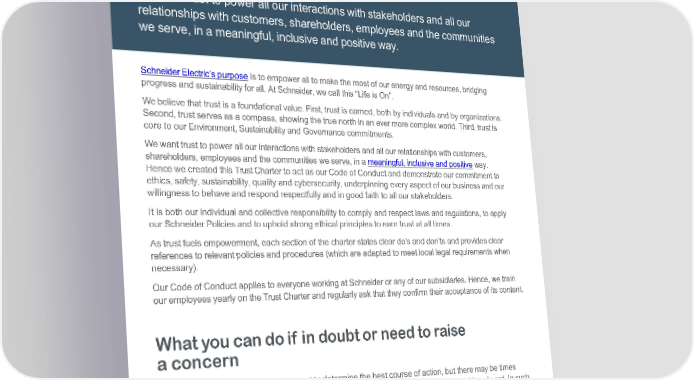 Trust Charter, SchneiderElectric’s CodeofConduct Wewanttrusttopowerallourinteractionswithstakeholdersandallour relationships with customers, shareholders, employees and the communities weserve,inameaningful,inclusiveandpositiveway. SchneiderElectric’s purpose is to empower all to make the most of our energy and resources, bridging progressandsustainability for all. At Schneider, we call this “Life is On”. Webelievethattrust is a foundational value. First, trust is earned, both by individuals and by organizations. Second,trustservesasacompass,showingthetruenorthinanevermorecomplexworld.Third,trustis core to our Environment, Sustainability and Governance commitments. Wewanttrusttopowerallourinteractionswithstakeholdersandallourrelationshipswith customers, shareholders, employees and the communities we serve, in a meaningful, inclusive and positive way. HencewecreatedthisTrust ChartertoactasourCodeofConductanddemonstrateourcommitmentto ethics, safety, sustainability, quality and cybersecurity, underpinning every aspect of our business and our willingness to behave and respond respectfully and in good faith to all our stakeholders. It is both our individual and collective responsibility to comply and respect laws and regulations, to apply our Schneider Policies and to uphold strong ethical principles to earn trust at all times. Astrust fuels empowerment, each section of the charter states clear do’s and don’ts and provides clear references to relevant policies and procedures (which are adapted to meet local legal requirements when necessary). OurCodeofConductappliestoeveryoneworkingatSchneideroranyofoursubsidiaries.Hence,wetrain ouremployeesyearlyontheTrust Charterandregularlyaskthattheyconfirmtheiracceptanceofitscontent. Whatyoucandoifindoubtorneedtoraise aconcern Weareencouragedtouseourjudgmenttodeterminethebestcourseofaction,buttheremaybetimes whenwefaceethicaldilemmasorareunsureandneedguidancetobetterunderstandhowtoact.Insuch cases, our network of Ethics Delegates is available for advice and support. Ouralert system Trust Line allows our employees and our external stakeholders to raise any concerns. When an alert is raised, it is subject to a thorough and confidential investigation, protecting all individuals involved. The findings of such investigations are then submitted to the relevant governing committees, who decide on the appropriate action to be taken. For more details, please refer to our whistleblowing policy.