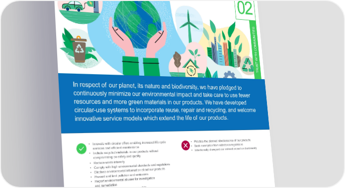 BeEfficient withResources 02 S E I T UNI M M CO H T WI T S U TR In respect of our planet, its nature and biodiversity, we have pledged to continuously minimize our environmental impact and take care to use fewer resourcesandmoregreenmaterialsinourproducts.Wehavedeveloped circular-use systems to incorporate reuse, repair and recycling, and welcome innovative service models which extend the life of our products. • Innovate with circular offers enabling increased life cycle • Practice the planned obsolescence of our products services and efficient maintenance • Seekexemption from substance regulations • Include recycled materials in our products without • Intentionally disregard our indirect impact on biodiversity compromising on safety and quality • Reducewasteintensity • Comply with high environmental standards and regulations • Disclose environmental information about our products • Prevent and limit pollution and emissions • Report environmental abuses for investigation and remediation • Savewaterandimplementresponsible sewagemanagement • Endorse initiatives to protect nature and wildlife