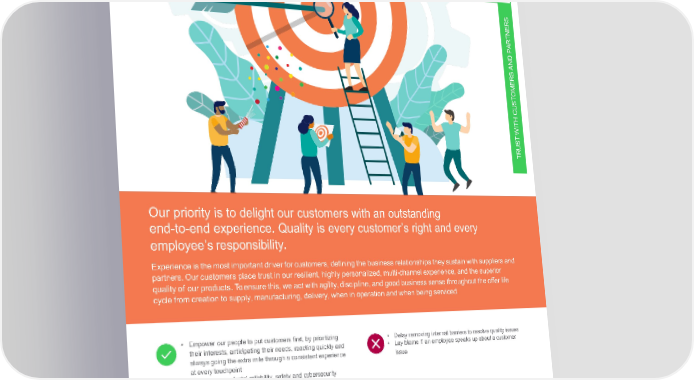 Strive for HighQuality 01 S ER N T PAR D AN RS E M O T CUS H T WI T S U TR Our priority is to delight our customers with an outstanding end-to-end experience. Quality is every customer’s right and every employee’sresponsibility. Experienceisthemostimportantdriverforcustomers,definingthebusinessrelationshipstheysustainwithsuppliers and partners. Our customers place trust in our resilient, highly personalized, multi-channel experience, and the superior quality of our products. To ensure this, we act with agility, discipline, and good business sense throughout the offer life cycle from creation to supply, manufacturing, delivery, when in operation and when being serviced. • Empowerourpeople to put customers first, by prioritizing • Delay removing internal barriers to resolve quality issues their interests, anticipating their needs, reacting quickly and • Layblame if an employee speaks up about a customer always going the extra mile through a consistent experience issue at every touchpoint • Ensure our products’ reliability, safety and cybersecurity to secure customers’ business continuity and protect their people, assets and data • Guarantee that our digitized end-to-end value chain drives resiliency at each touchpoint when customers seek to “get quotations, place and follow orders, get delivered, or get technical support” • Makesureouranalytics, processes and people make the difference, to deliver the ultimate customer experience • Listen carefully and continuously, turning insights into value via end-to-end improvement • Respect our promises to customers by not compromising on quality at any point in the lifecycle of our offers