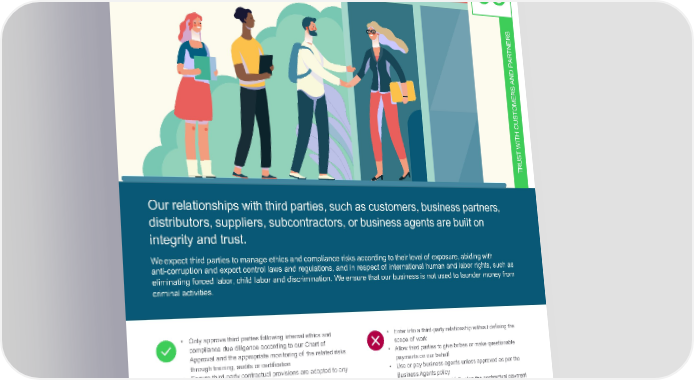 RequireThird-Party Integrity 05 S ER N T PAR D AN RS E M O T CUS H T WI T S U TR Ourrelationships with third parties, such as customers, business partners, distributors, suppliers, subcontractors, or business agents are built on integrity and trust. Weexpectthirdparties to manage ethics and compliance risks according to their level of exposure, abiding with anti-corruption and export control laws and regulations, and in respect of international human and labor rights, such as eliminating forced labor, child labor and discrimination. We ensure that our business is not used to launder money from criminal activities. • Only approve third parties following internal ethics and • Enter into a third-party relationship without defining the compliance due diligence according to our Chart of scope of work Approval and the appropriate monitoring of the related risks • Allow third parties to give bribes or make questionable through training, audits or certification paymentsonourbehalf • Ensure third-party contractual provisions are adapted to any • Useorpaybusinessagents unless approved as per the identified risks Business Agents policy • Enforce our Supplier’s Code of Conduct • Payathird-party without following the contractual payment • Ensure third-parties’ scope of work is contractually defined, terms, an invoice or prior approval according to our Chart their performance effective, and payment proportionate to of Approval industry and local standards • Ensure that payments to third parties, especially business agents, are accurate and auditable • Ensurethat our activities are not used for money laundering • Closely monitor our third party relationships and business requirements, with specific metrics