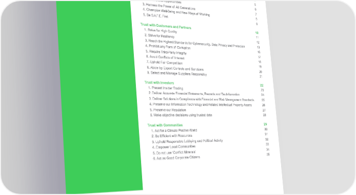Tableof Contents Trusted Teams 4 1. Exemplify Our Leadership Expectations 5 2. Create Equal Opportunities 6 3. Harness the Power of All Generations 7 4. Champion Well-Being and New Ways of Working 8 5. Be S.A.F.E. First 9 TrustwithCustomersandPartners 10 1. Strive for High Quality 11 2. Strive for Resiliency 12 3. Reach the Highest Standards for Cybersecurity, Data Privacy and Protection 13 4. Prohibit any Form of Corruption 16 5. Require Third-Party Integrity 17 6. Avoid Conflicts of Interest 18 7. Uphold Fair Competition 19 8. Abide by Export Controls and Sanctions 20 9. Select and Manage Suppliers Responsibly 21 TrustwithInvestors 22 1. Prevent Insider Trading 23 2. Deliver Accurate Financial Statements, Records and Tax Information 24 3. Deliver Solutions in Compliance with Financial and Risk Management Standards 25 4. Preserve our Information Technology and Related Intellectual Property Assets 26 5. Preserve our Reputation 27 6. Make objective decisions using trusted data 28 TrustwithCommunities 29 1. Act for a Climate Positive World 30 2. Be Efficient with Resources 31 3. Uphold Responsible Lobbying and Political Activity 32 4. EmpowerLocalCommunities 33 5. Do not use ‘Conflict Minerals’ 34 6. Act as Good Corporate Citizens 35