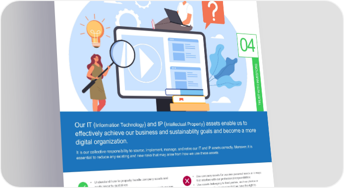 PreserveourInformation TechnologyandRelated Intellectual Property Assets 04 S OR T S E V IN H T WI T S U TR OurIT(InformationTechnology) and IP (IntellectualProperty) assets enable us to effectively achieve our business and sustainability goals and become a more digital organization. It is our collective responsibility to source, implement, manage, and retire our IT and IP assets correctly. Moreover, it is essential to reduce any existing and new risks that may arise from how we use these assets. • Understand how to properly handle company assets and • Usecompanyassetsforourownpersonalneedsorinways apply security guidelines that interfere with our professional responsibilities • Give the same level of care to those company assets we use • Useassets belonging to third parties, such as photos or aswewouldtoourownassets videos, etc., without ensuring that we have the right to • Apply sustainable thinking when working with or returning usethem our company assets • Acquire, sell, transfer, or dispose of any IT or IP assets • Apply our Source Code Governance policy when creating without following Schneider’s process softwareIP