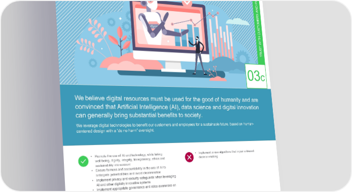 c) UseAIandDataScienceresponsibly S ER N T PAR D AN RS E M O T CUS H T WI T S U TR 03c Webelieve digital resources must be used for the good of humanity and are convinced that Artificial Intelligence (AI), data science and digital innovation cangenerally bring substantial benefits to society. Weleveragedigital technologies to benefit our customers and employees for a sustainable future, based on human- centered design with a ‘do no harm’ oversight. • Promote the use of AI and technology, while taking • Implement or use algorithms that impair unbiased well-being, dignity, integrity, transparency, ethics and decision-making sustainability into account • Ensure fairness and accountability in the use of AI to anticipate potential bias and avoid discrimination • Implement privacy and security safeguards when leveraging AI and other digitally innovative systems • Implement appropriate governance and raise awareness on the possible impact of AI • Develop algorithmic transparency and other automated decision-supporting digital technologies • Act fairly when making decisions based on AI algorithms, addressing potential bias, aiming for equal treatment and respecting individuals’ legal rights