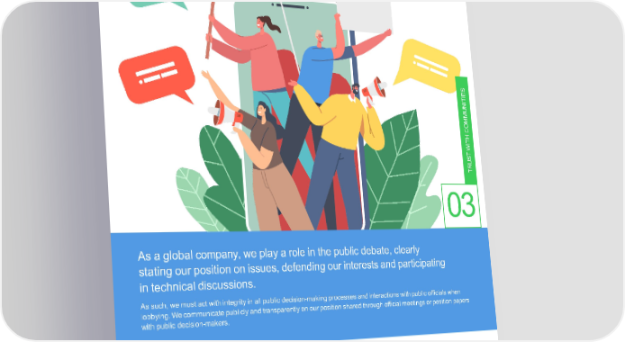 UpholdResponsibleLobbying andPolitical Activity S E I T UNI M M CO H T WI T S U TR 03 Asaglobalcompany,weplayaroleinthepublicdebate,clearly stating our position on issues, defending our interests and participating in technical discussions. Assuch,wemustactwithintegrityinall public decision-making processes and interactions with public officials when lobbying. We communicatepubliclyandtransparently onourpositionsharedthroughofficial meetings orpositionpapers with public decision-makers. • Take part in lobbying and representation activities only when • Participate in activities that could be considered as taking a authorized partisan position on behalf of Schneider • Report our lobbying activities where requested • Makecontributions (either monetary or in-kind) to political • Strictly adhere to laws governing lobbying and interaction bodies directly or through third parties with public officials, and expect the same from third-parties • Getinvolved in political activity or representation on behalf who act on our behalf of Schneider • Interact with public officials or participate in activities that could be considered as taking a partisan position or which maycomprise Schneider’s reputation