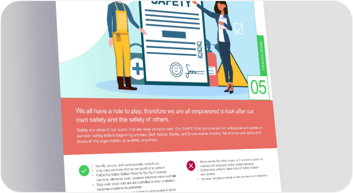 BeS.A.F.EFirst S M A TE D TE S U TR 05 Weallhavearoletoplay,thereforeweareallempoweredtolookafterour ownsafetyandthesafetyof others. Safety is a value of our brand, that we never compromised. Our ‘S.A.F.E. First’ principle remind us to pause and assess on ourownsafetybeforebeginninganytask(Self, Activity, Facility, and Environmental checks). We strive to work safely at all levels of the organization, at anytime, anywhere. • Identify, assess, and systematically control risks • Blamepeopleforsafetyissues,orif someone speaks up • Only carry out tasks that we are qualified to perform • Interfere with or bypass safety control measures • Follow the Safety Golden Rules for the Top 5 Hazards: • Dobusinesswithoutaclearvisionof safety hazards machine, electrical, road, powered industrial trucks and falls and controls • Stop work when risks are not controlled or when a situation • Become complacent about unsafe decisions and situations becomesunsafe to be performed • Report all opportunities and events to continuously improve our health and safety systems, and share solutions so others can learn • Lookoutfor the safety of our colleagues, contractors, and customers. Truly caring for each other