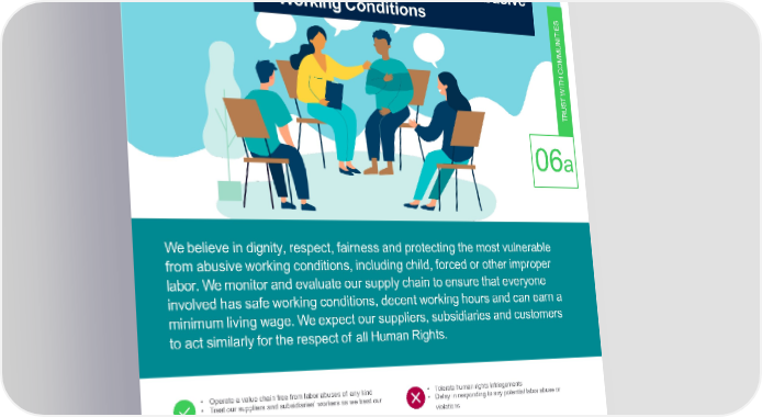 ActasGood CorporateCitizens a) Protect the VulnerablefromAbusive WorkingConditions S E I T UNI M M CO H T WI T S U TR 06a Webelieveindignity, respect, fairness and protecting the most vulnerable from abusive working conditions, including child, forced or other improper labor. We monitor and evaluate our supply chain to ensure that everyone involved has safe working conditions, decent working hours and can earn a minimumlivingwage.Weexpectoursuppliers,subsidiariesandcustomers to act similarly for the respect of all Human Rights. • Operate a value chain free from labor abuses of any kind • Tolerate human rights infringements • Treat our suppliers and subsidiaries’ workers as we treat our • Delay in responding to any potential labor abuse or ownemployees violations • Conduct due diligence with suppliers, contractors and other stakeholders • Continuously improve our entire supply chain through dialogue, information sharing and training • WorkwithNGOs,businessassociationsandother companies to collectively improve working conditions